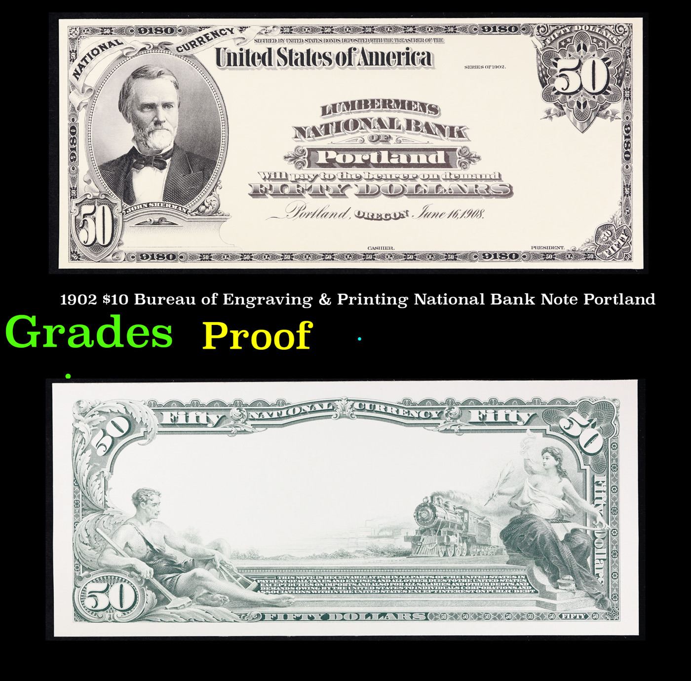 1902 $10 Bureau of Engraving & Printing National Bank Note Portland Grades Proof. Up for auction is a Bureau of Engraving and Printing (BEP) Proof Print . It is printed using the original Plates from the Bureau of Engraving and Printings archives. It was printed on two separate strikes, for the front and the back. It lacks serial numbers, but otherwise is a perfect proof of the Incredibly rare Piece of Currency.
