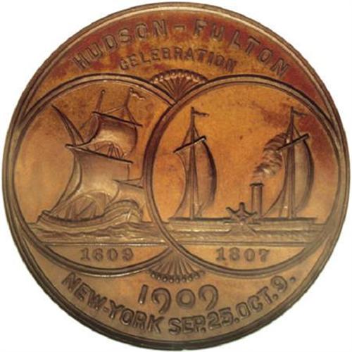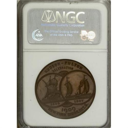 <B><I>Proof</B></I></B></I><B> 1909 Hudson-Fulton, HK-381, PR64 Brown NGC.</B></I> Bronze, 38.1 mm, "rare" (HK, 1963) and no doubt exceedingly rare as a proof striking, since this is the sole proof example certified at NGC (8/07). The crisp hair details, glossy mirrored fields, and smooth, squared rims all point to an undeniable proof status. Milk-chocolate with some glints of olive-green iridescence.<BR><BR><b>Shipping:</b> Coins & Currency (<a target="_blank" href="http://www.heritageauctions.com/common/shipping.php">view shipping information</a>)