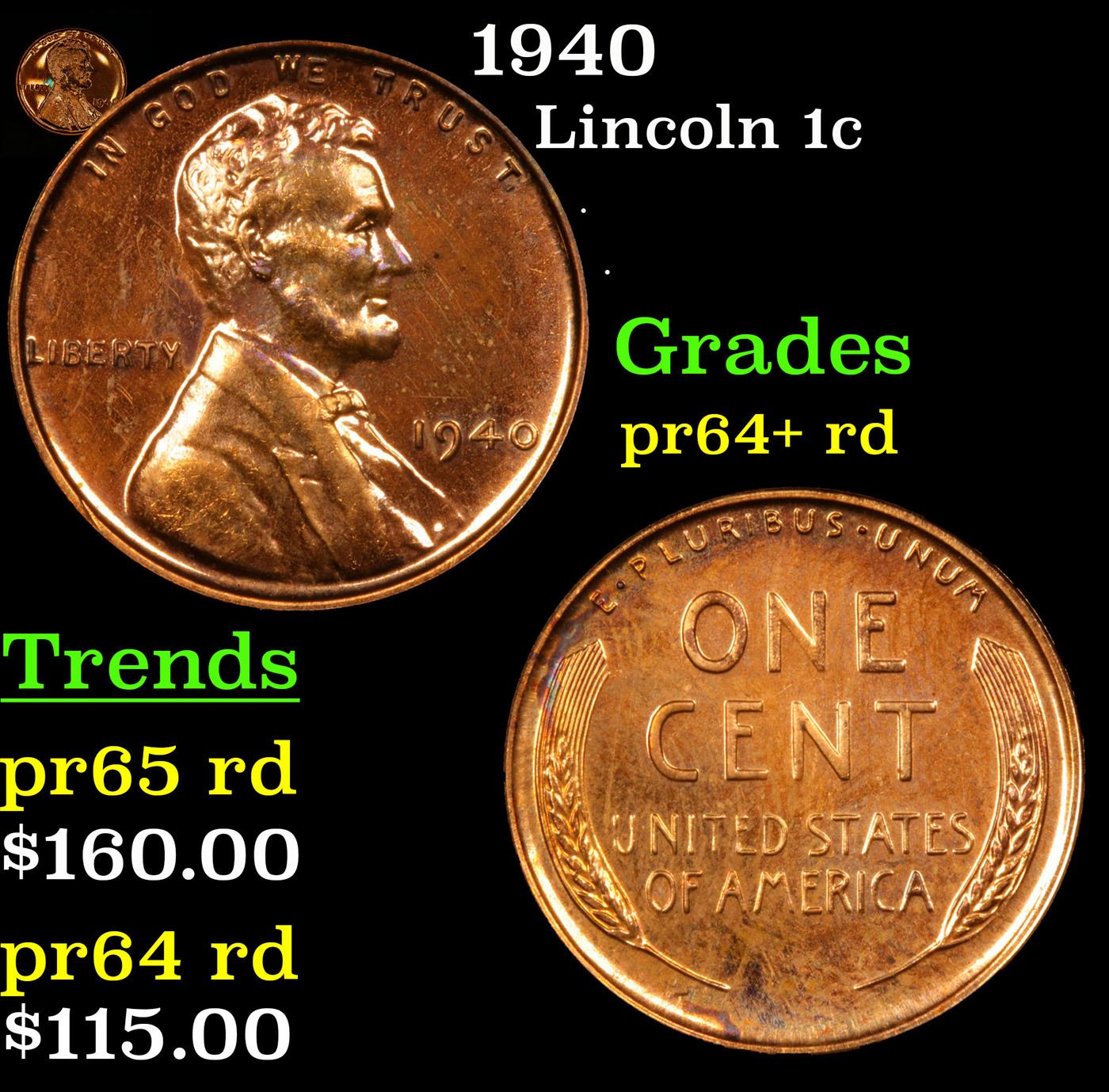1940 Lincoln Cent 1c Grades Choice+ Rd Proof.