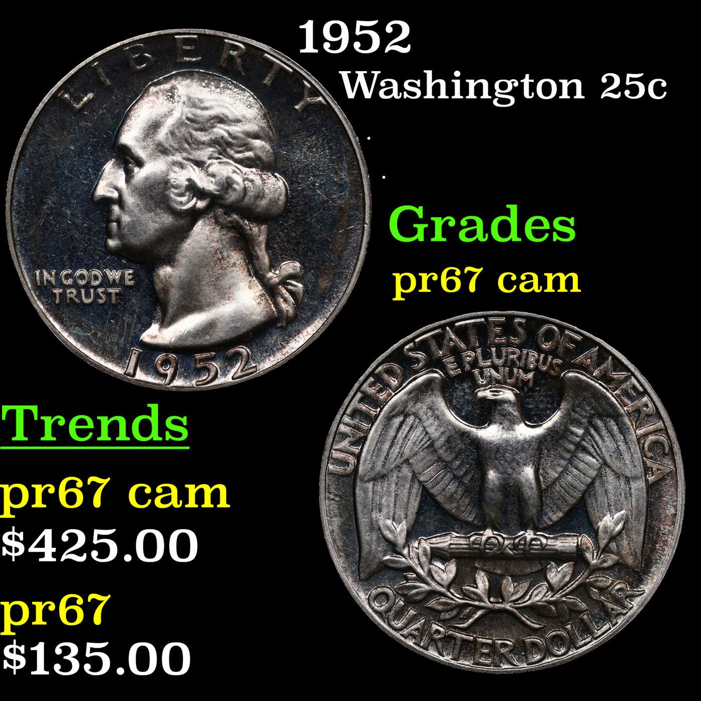 1952 Washington Quarter 25c Grades GEM++ Proof Cameo.