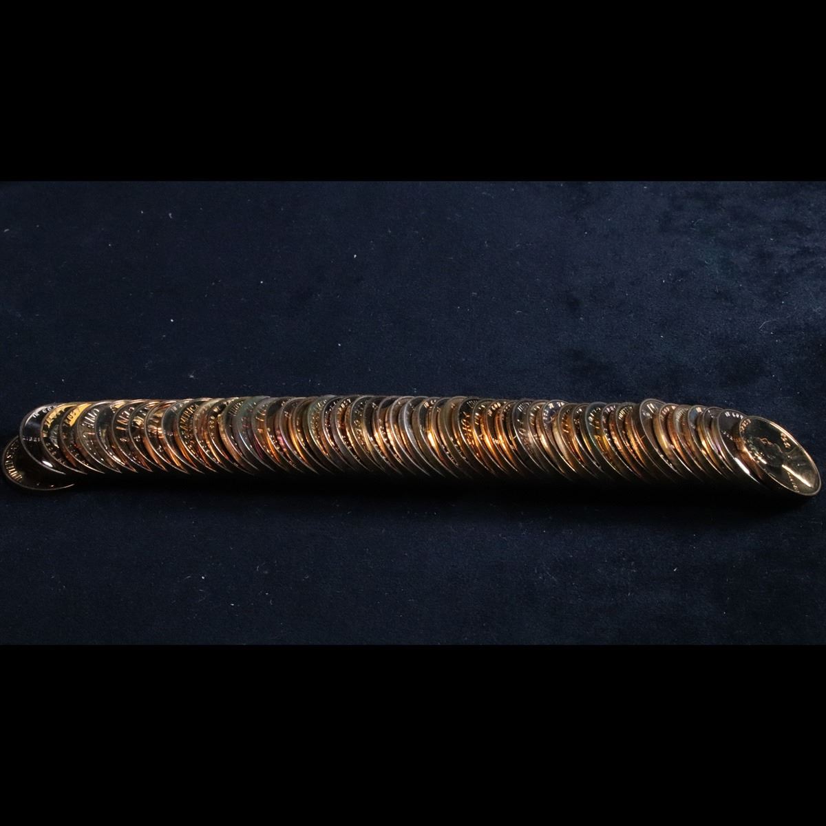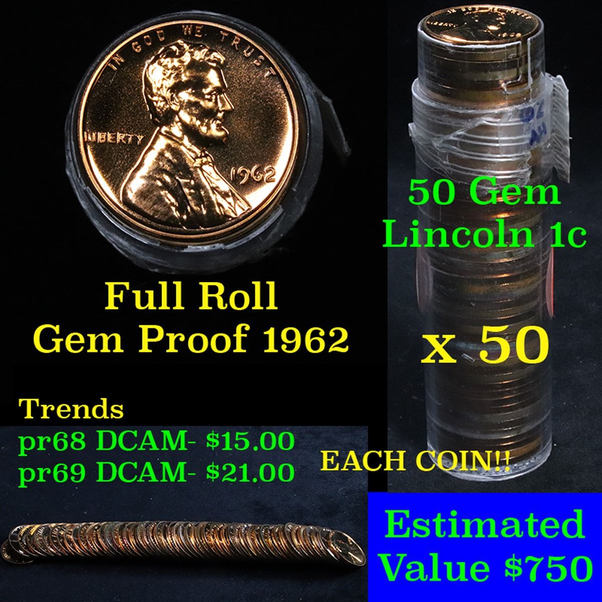Proof 1962 Lincoln cent 1c roll, 50 pieces (fc). A terrific proof roll of Lincoln cents. All red, and deep cameo. Trends pr68rd dcam is $15/coin, Pr69 rd DCAM $21/coin Estimate $300