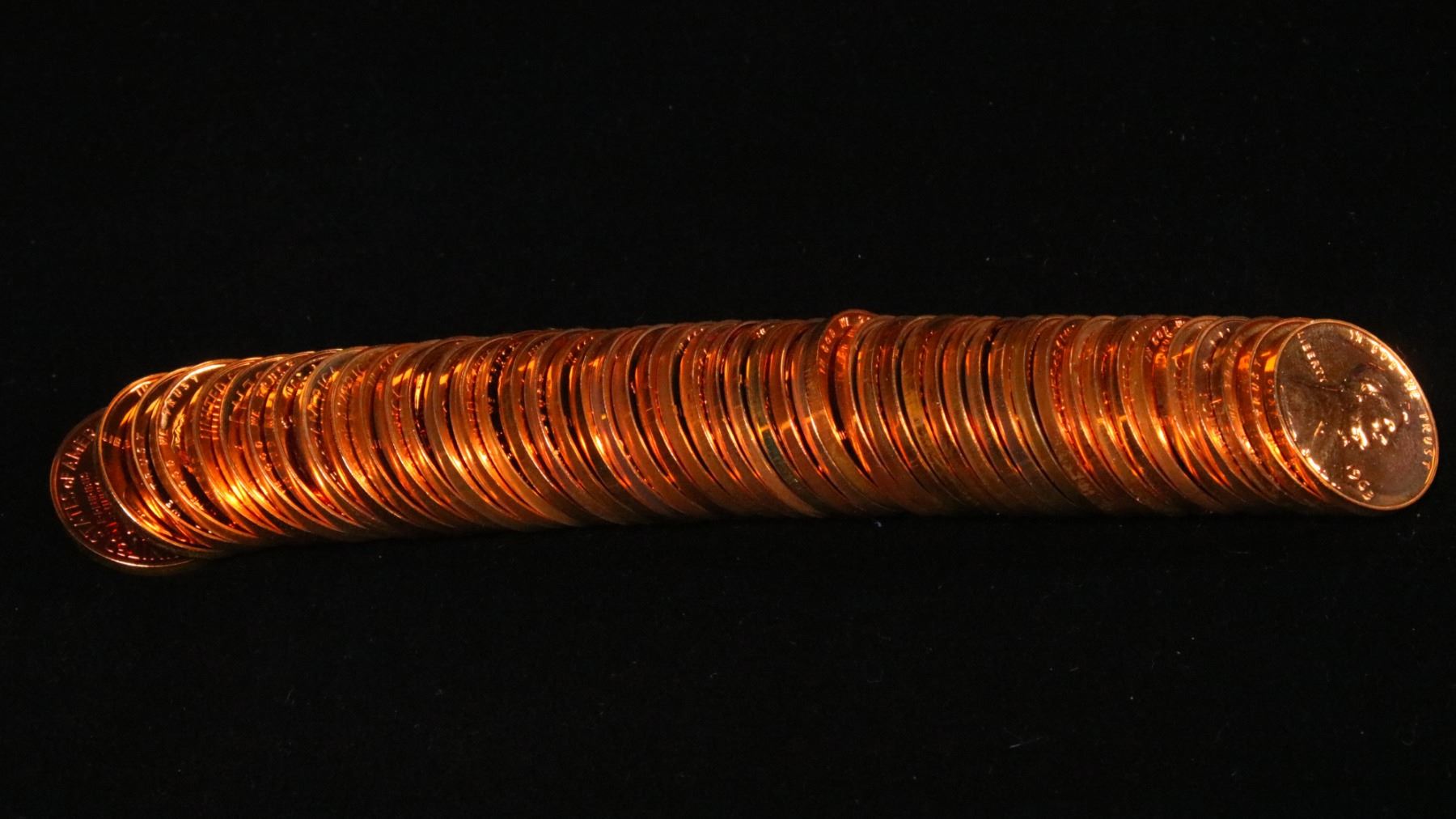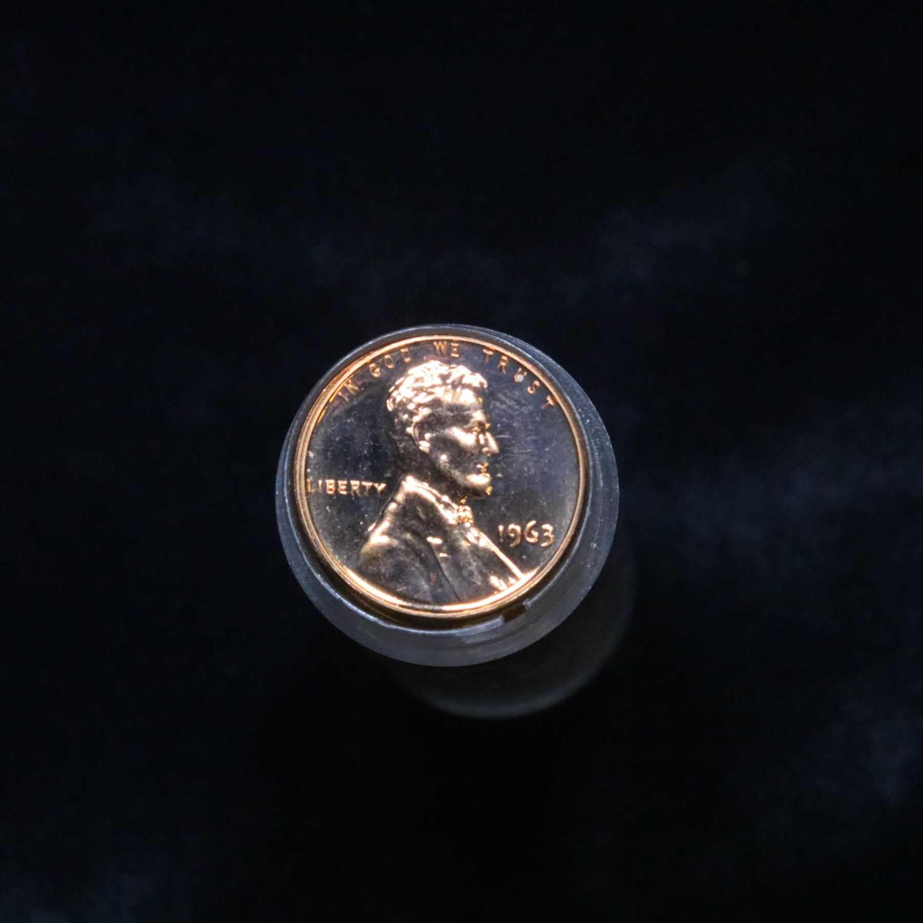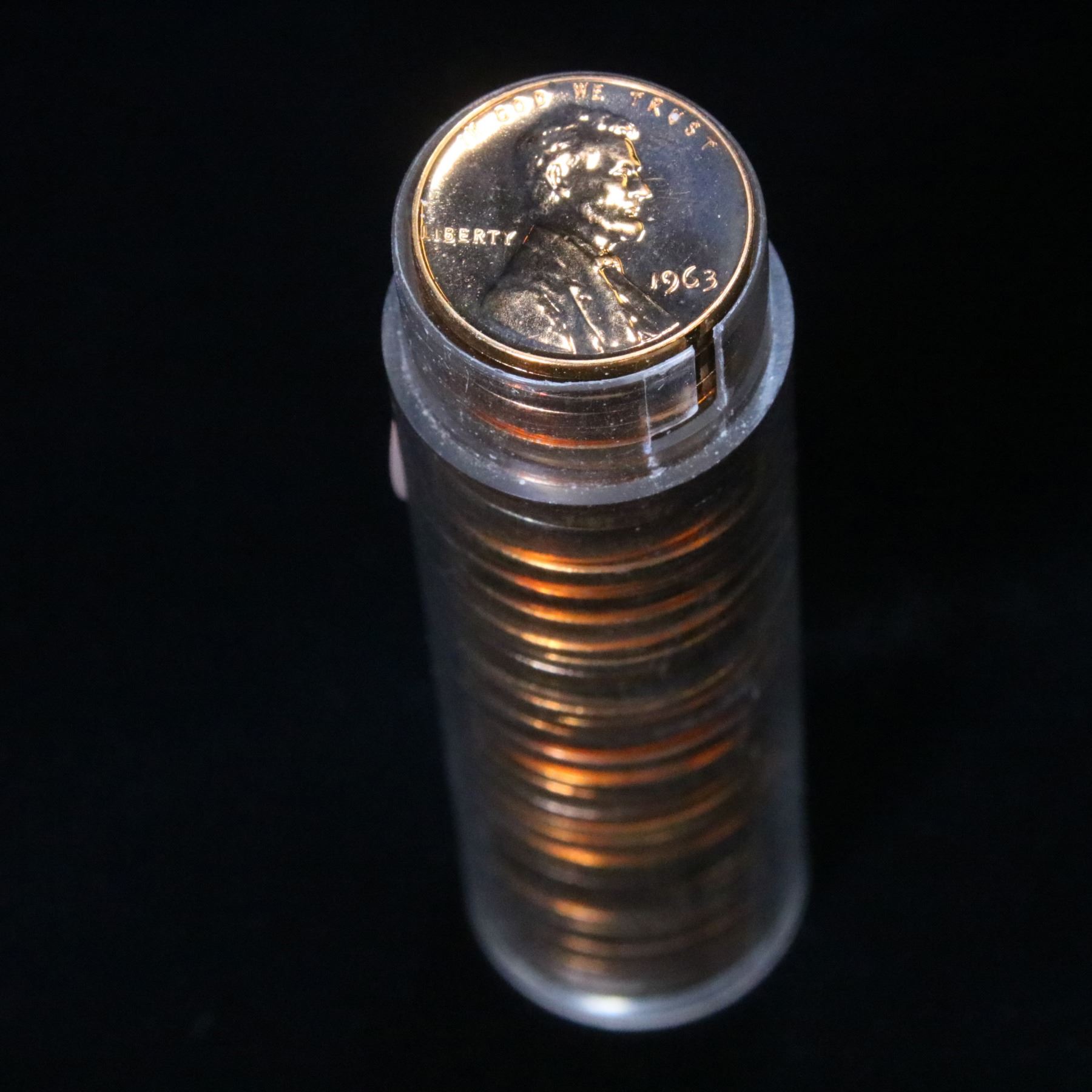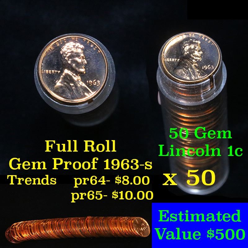 Proof 1963 Lincoln cent 1c roll, 50 pieces. A terrific proof roll of Lincoln cents. All red, many cameo & deep cameo. Trends pr65rd cam is $10/coin and pr64rd Cam at $8/coin, $400