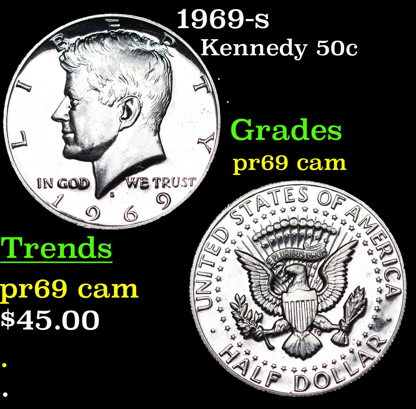 1969-s Kennedy Half Dollar 50c Grades GEM++ Proof Cameo.