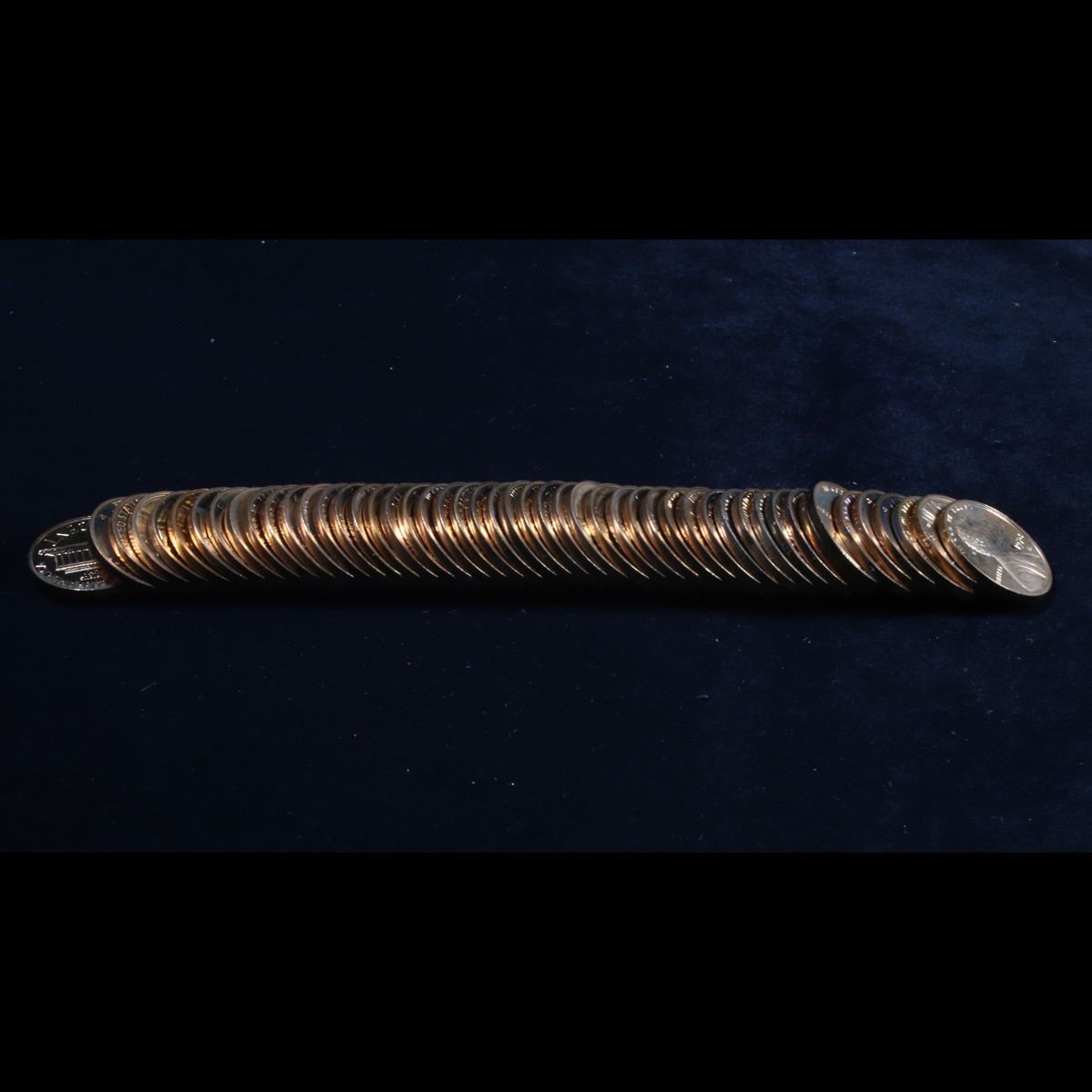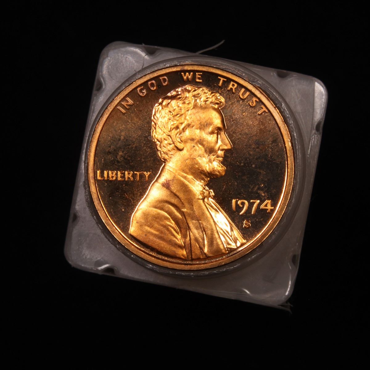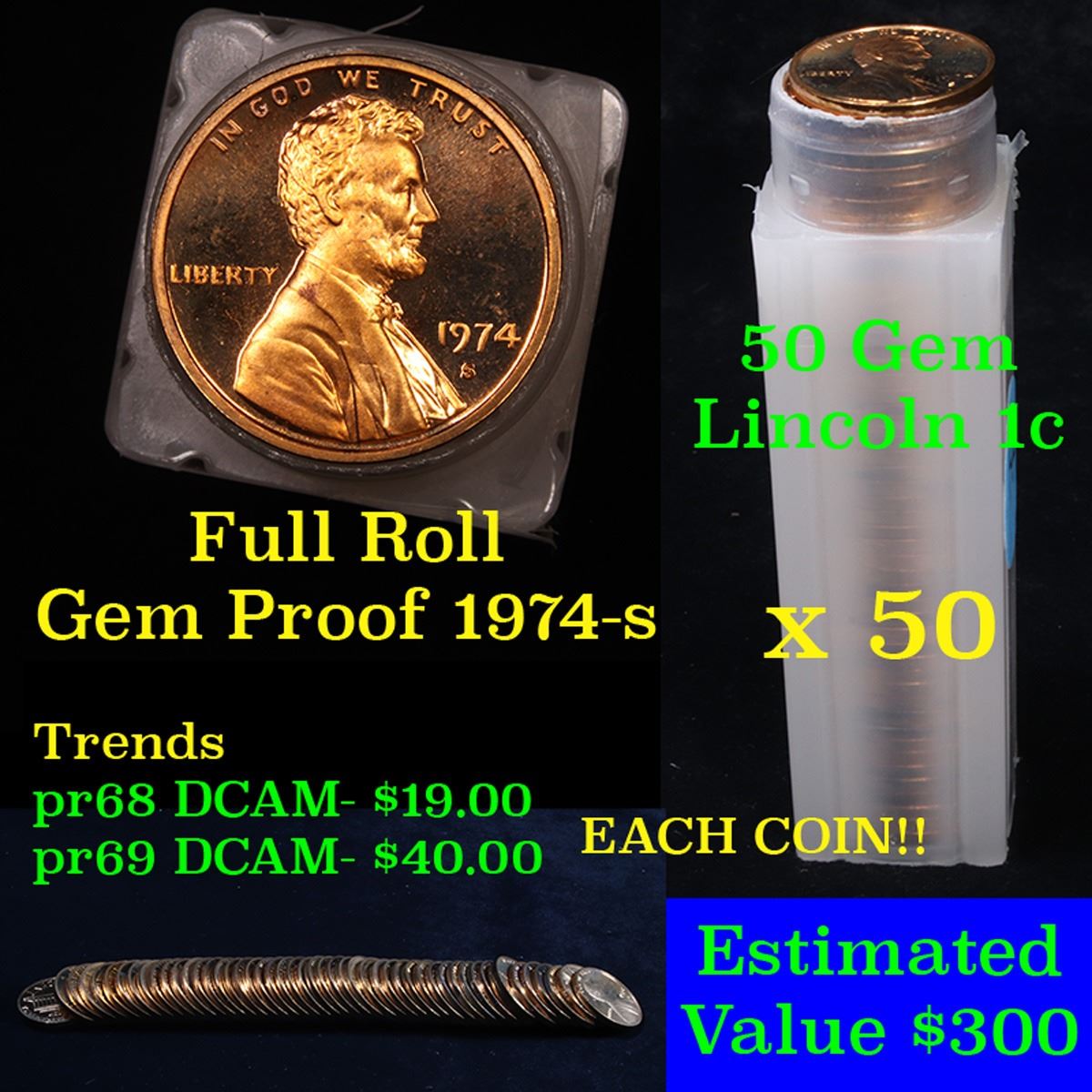 Proof 1974-s Lincoln cent 1c roll, 50 pieces (fc).        A terrific proof roll of Lincoln cents.  All red, all cameo or deep cameo.  Trends pr68rd cam is $19/coin, Pr69 rd CAM $40/coin.  Estimate $950