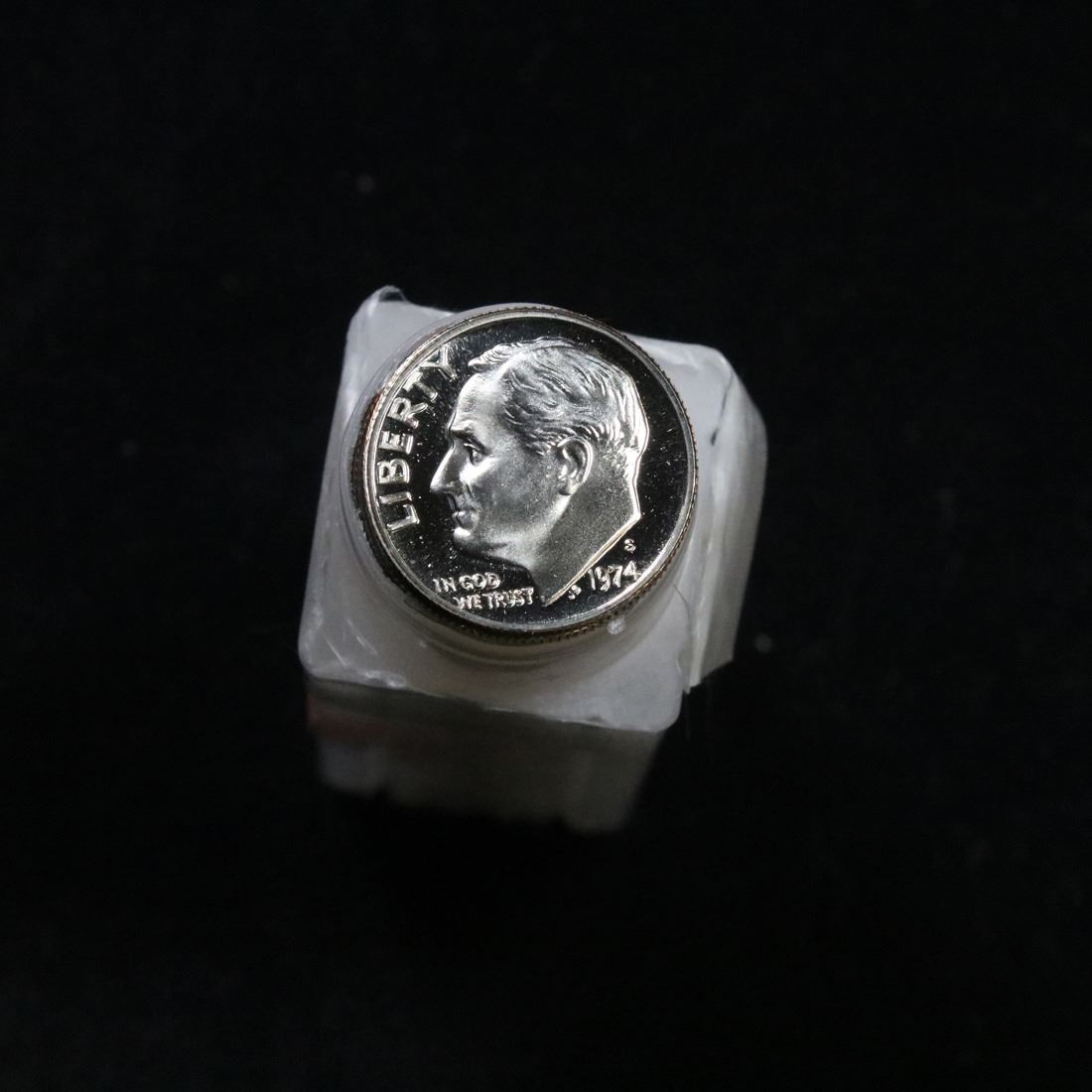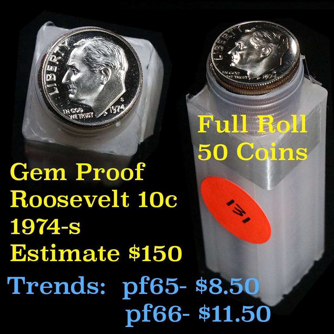 Proof 1974-s Roosevelt Dime 10c roll, 50 pieces (fc).        A great roll of proof Roosevelt dimes.  Some cameo's and deep cameo's.  pr65Cam trends $8.50/coin, $425