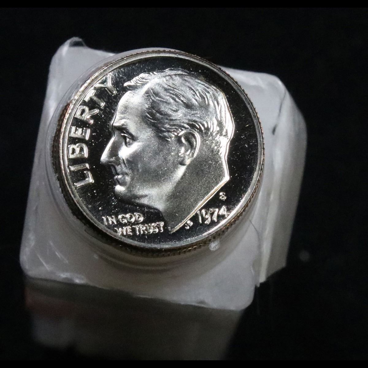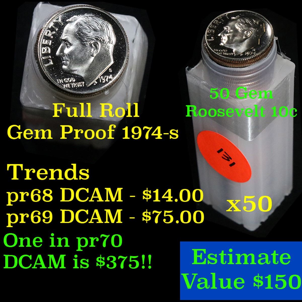 Proof 1974-s Roosevelt Dime 10c roll, 50 pieces (fc). A great roll of proof Roosevelt dimes. Some cameo's and deep cameo's. Pr68 DCAM $14/Coin Pr69 DCAM $75/Coin and in PR70 DCAM $375/Coin Trends