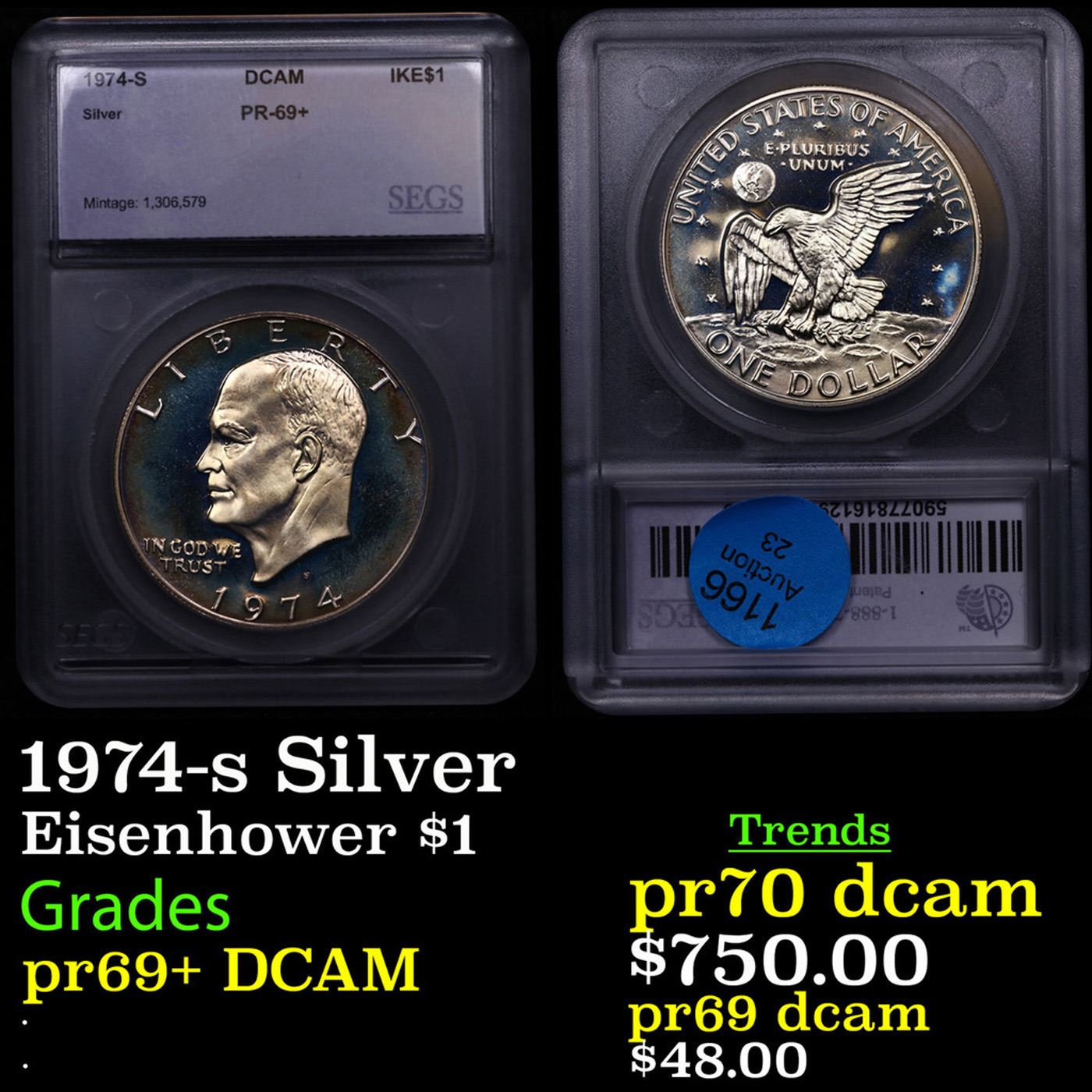 1974-s Silver Eisenhower Dollar $1 Graded pr69+ DCAM BY SEGS.