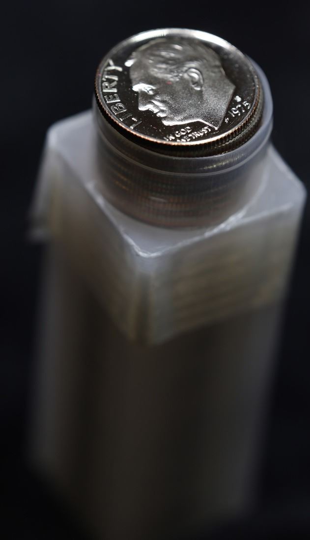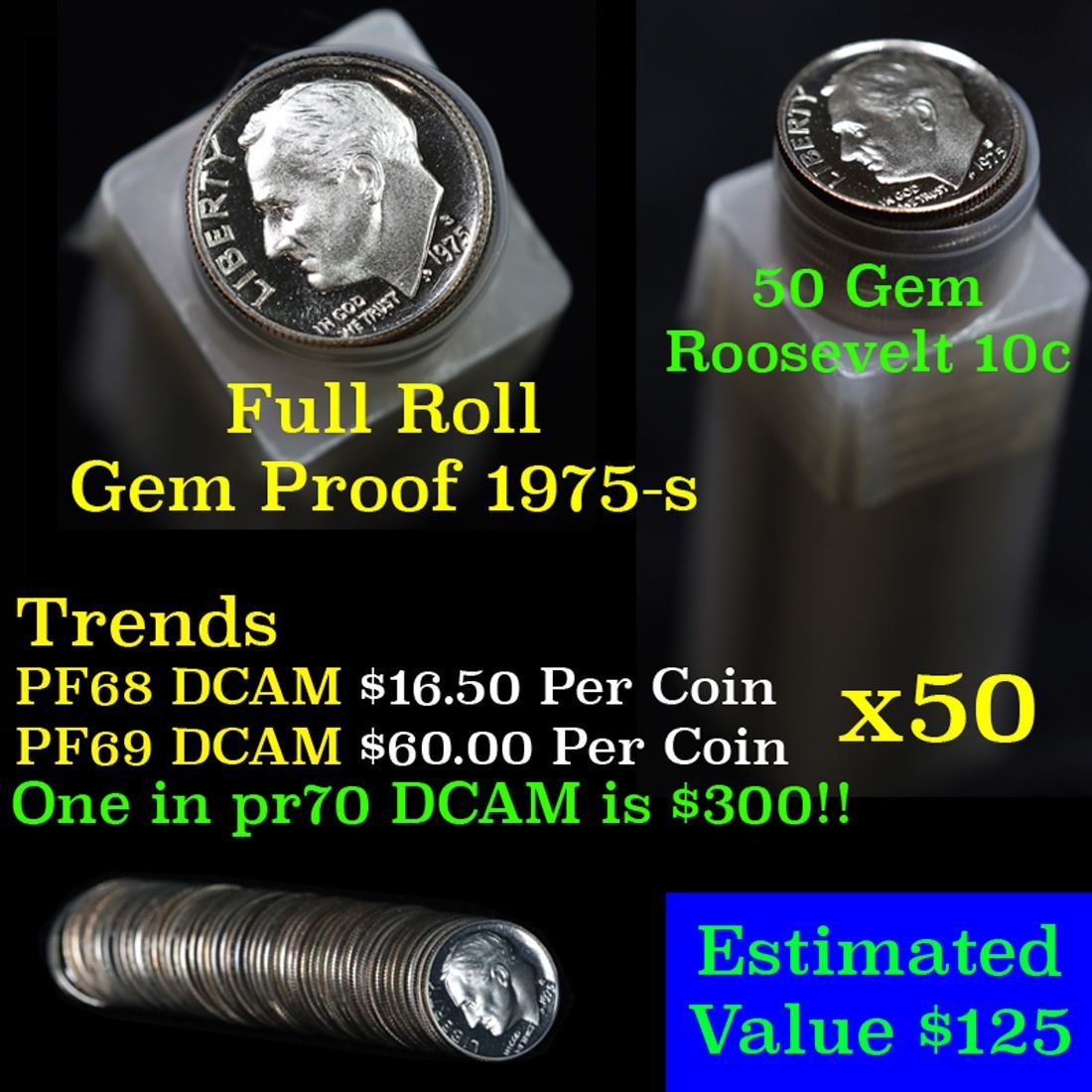 Proof 1975-s Roosevelt Dime 10c roll, 50 pieces (fc). A great roll of proof Roosevelt dimes. Some cameo's and deep cameo's. pr65Cam trends $8.50/coin, $425