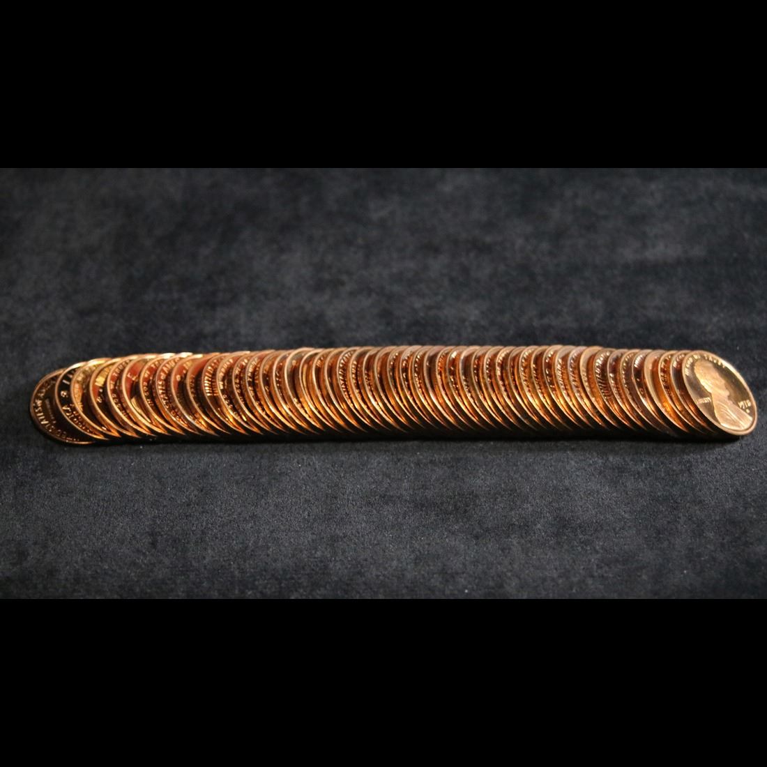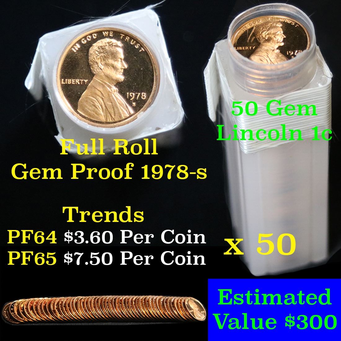 Proof 1978-s Lincoln cent 1c roll, 50 pieces (fc) . .. A terrific proof roll of Lincoln cents. All red, and deep cameo. Trends pr65rd dcam is $7/coin, $350