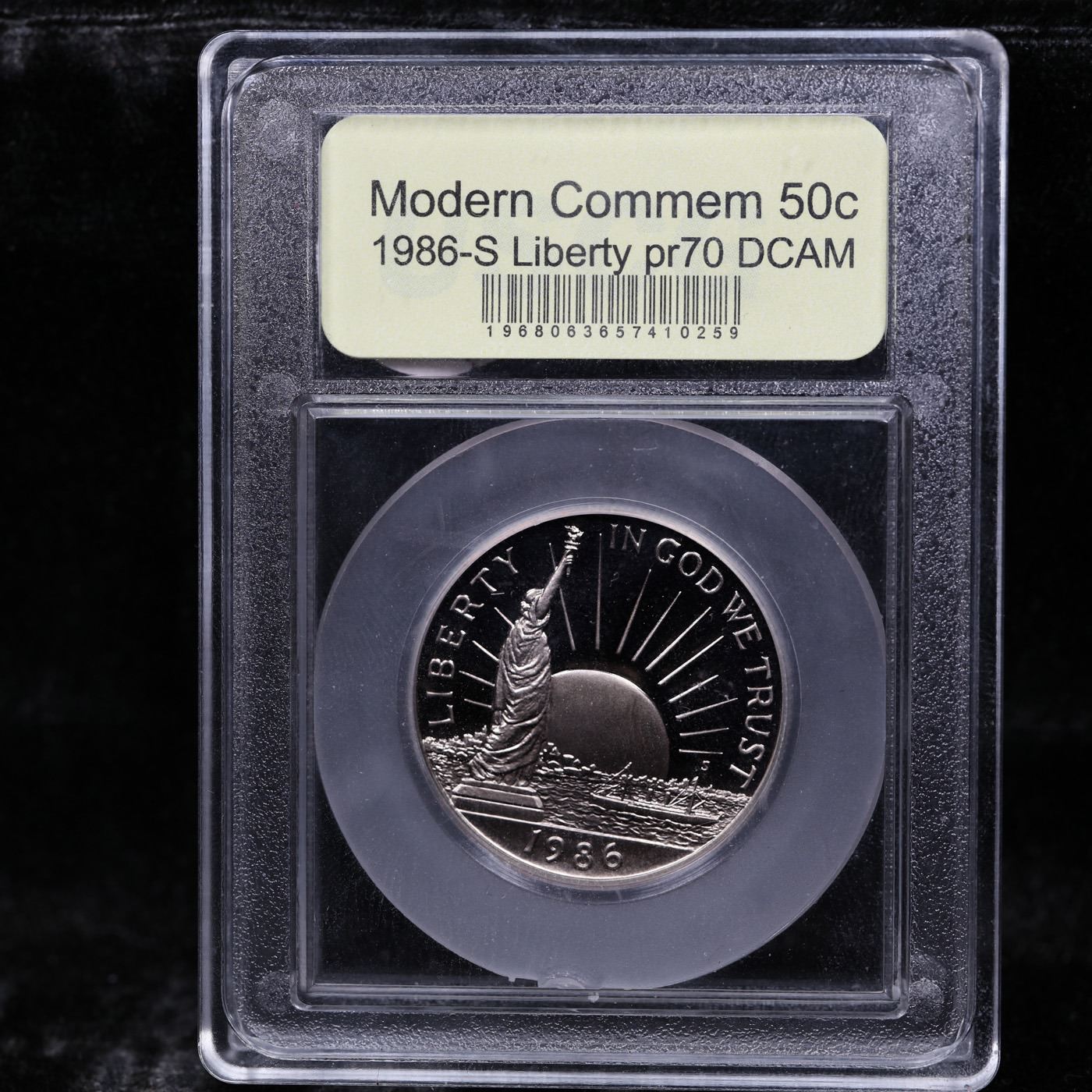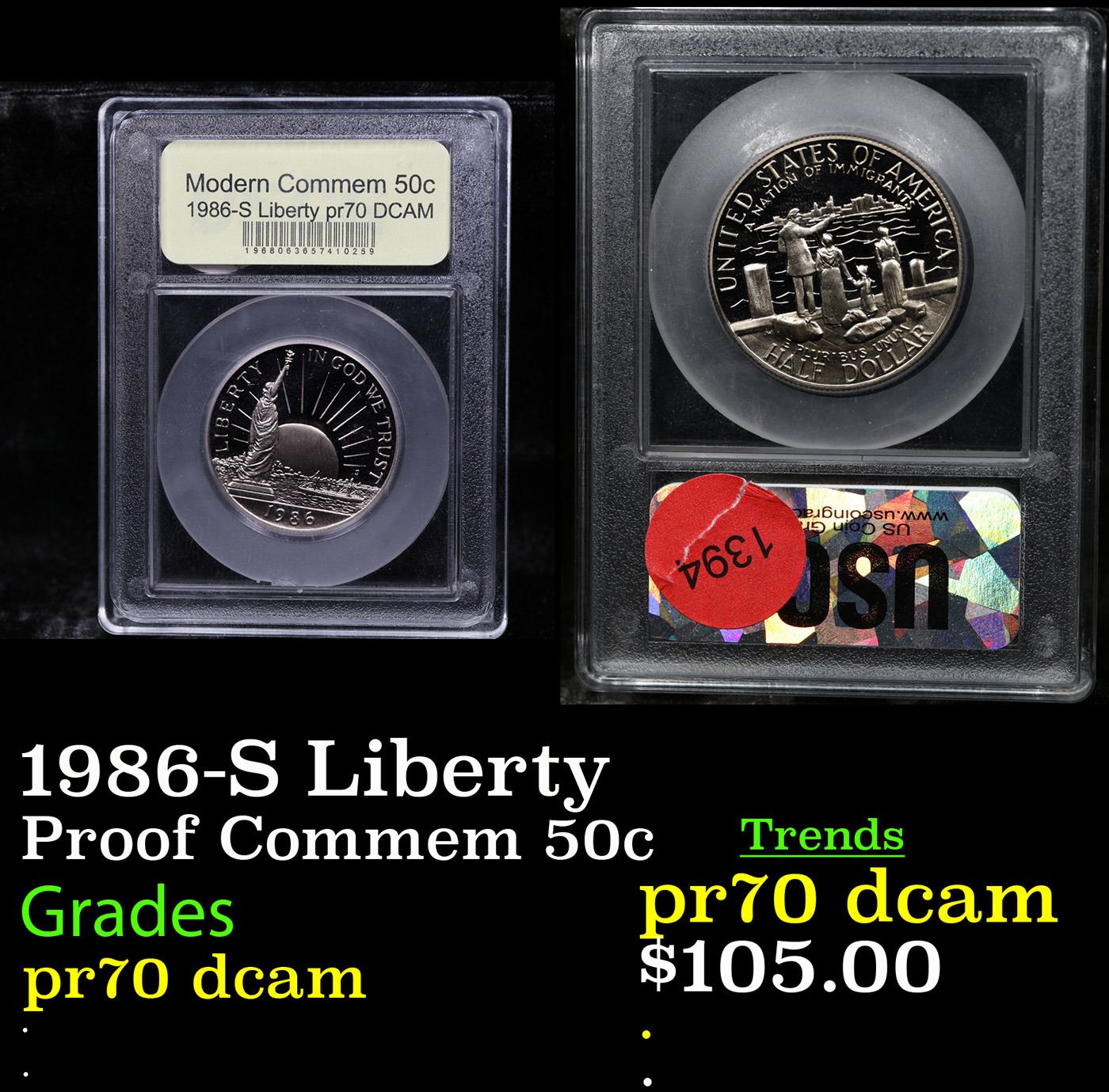 1986-S Liberty Modern Commem Half Dollar 50c Graded GEM++ Proof Deep Cameo By USCG. This Statue of Liberty commemorative pays homage to Ellis Island. PCGS lists PR70 DCAM at $700. This example is Graded PR70 DCAM by USCG. Estimated Value $150.
