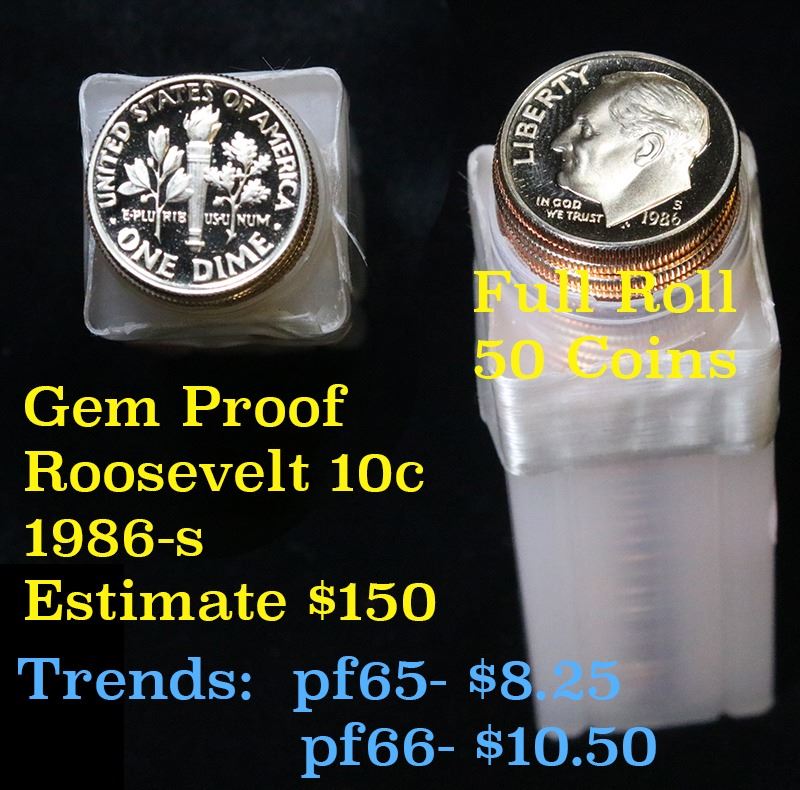 Proof 1986-s Roosevelt Dime 10c roll, 50 pieces. A great roll of proof Roosevelt dimes. All deep cameo's. Pr65Cam trends $8.25/coin, $415