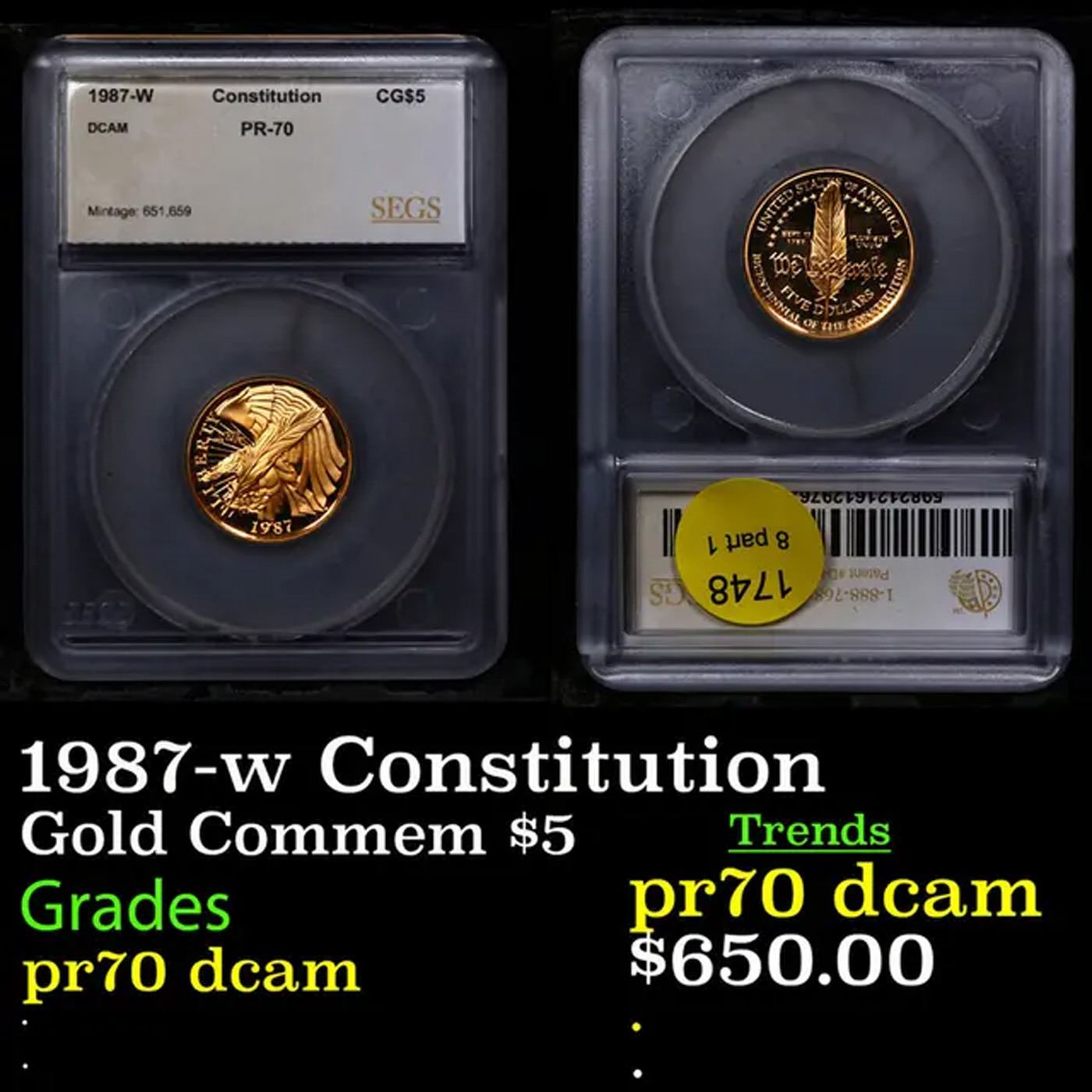 1987-w Constitution Gold Commemorative $5 Graded pr70 dcam By SEGS. A Key Date's Pick