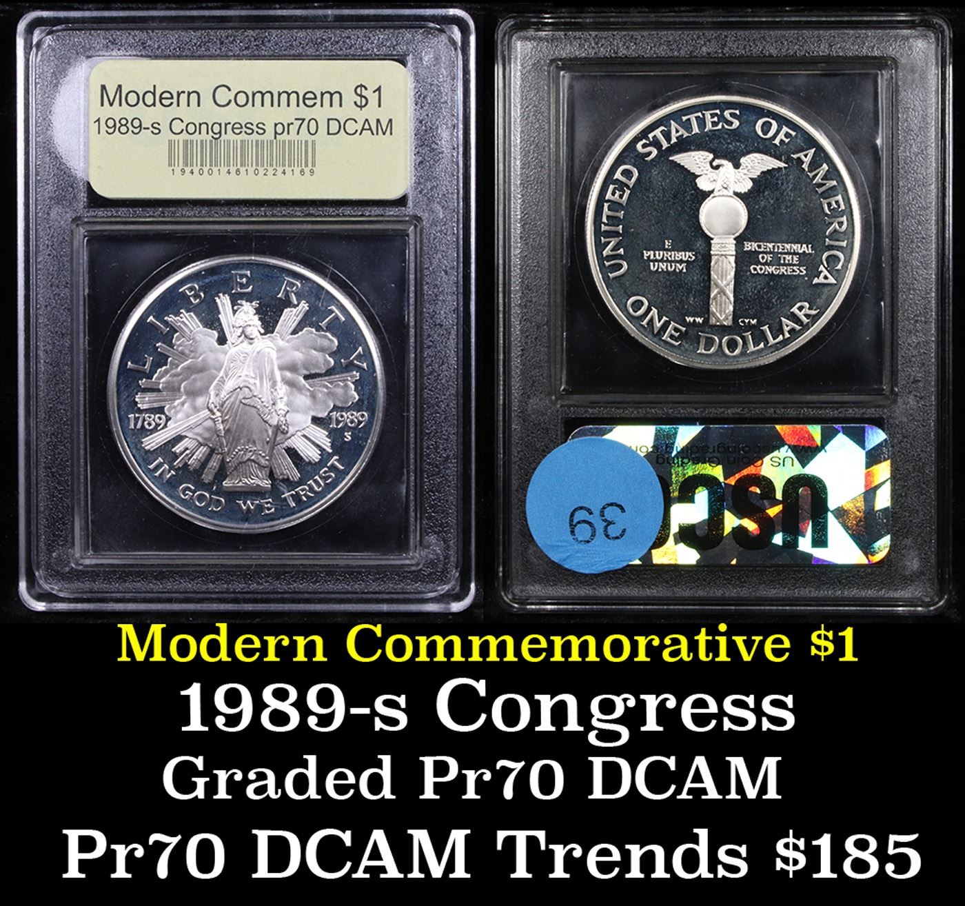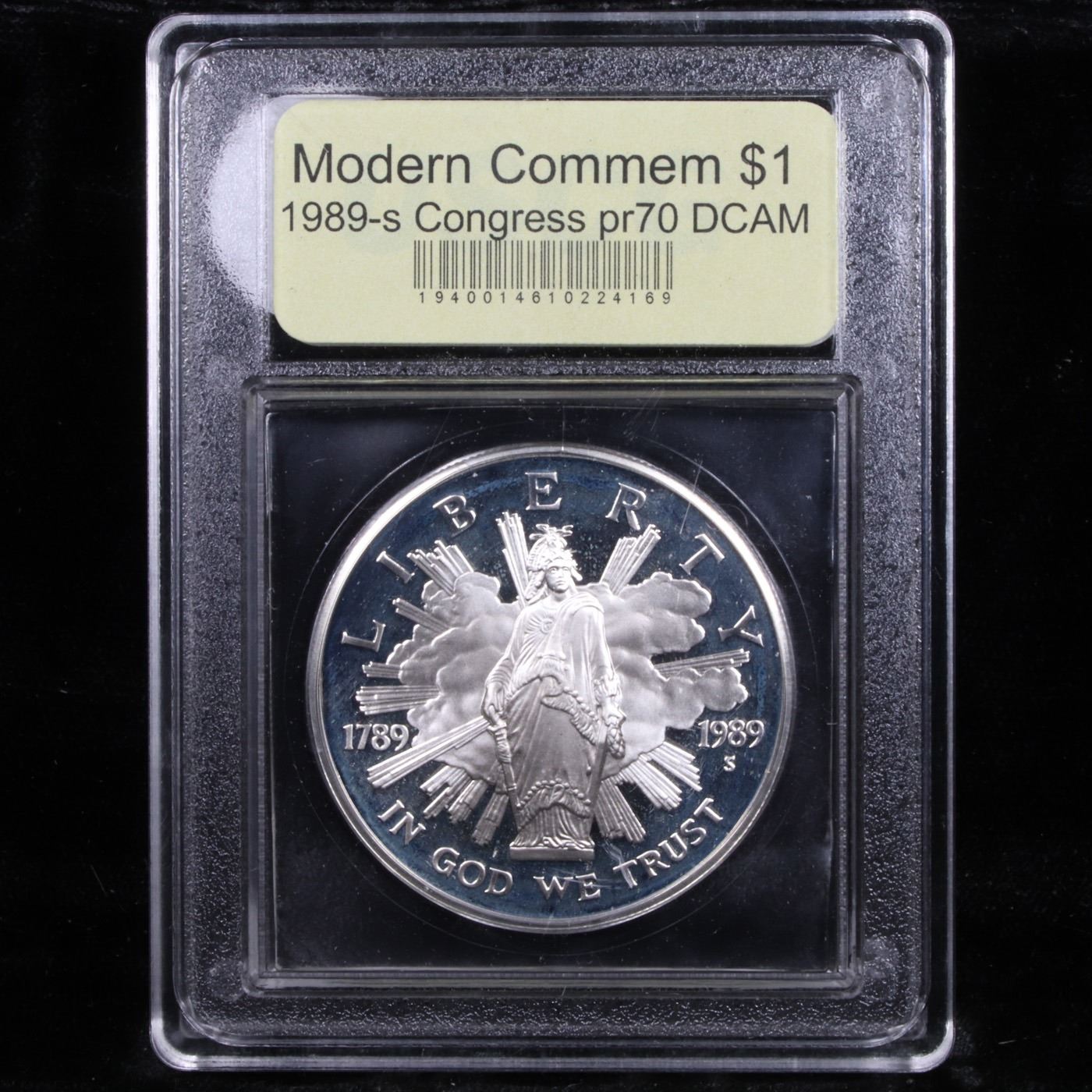 1989-S Congress Modern Commem Dollar $1 Graded GEM++ Proof Deep Cameo By USCG. The 1989 Congress Bicentennial Commemorative Dollar was one of three coins released to celebrate the 200th anniversary of Congress. The legislative body had first convened under the US Constitution in 1789 in Philadelphia. Certified and Graded PR70 Deep Cameo by USCG.