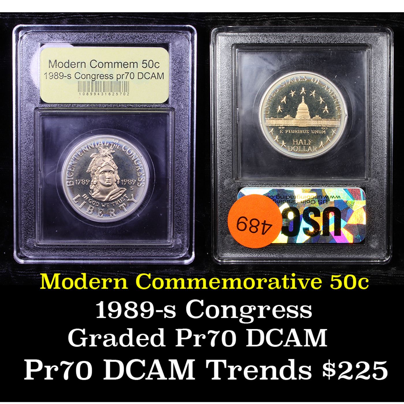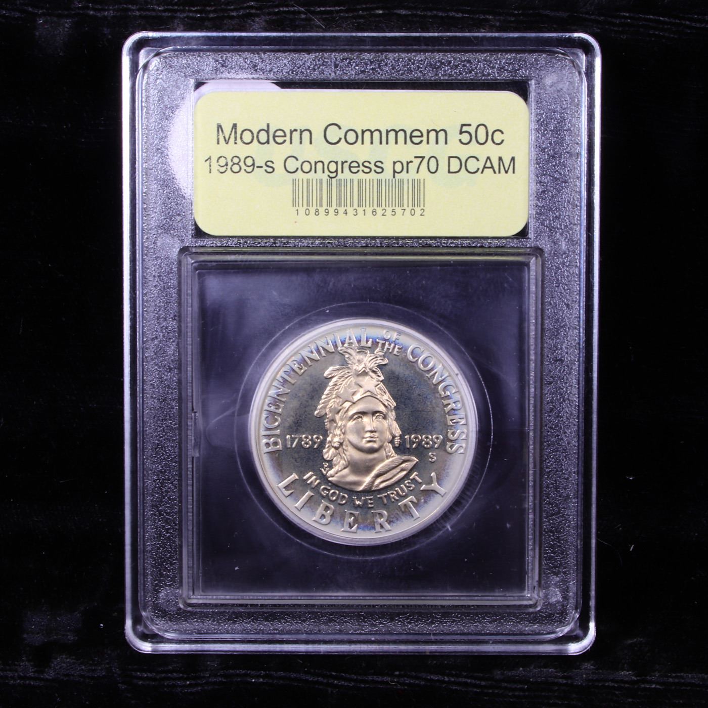 1989-S Congress Modern Commem Half Dollar 50c Graded GEM++ Proof Deep Cameo By USCG. The 1989 Congress Bicentennial Commemoratives were issued three ways released to celebrate the 200th anniversary of Congress. The legislative body had first convened under the US Constitution in 1789 in Philadelphia. This is a 1989-s proof silver dollar and a 1989-s proof half. Graded by USCG