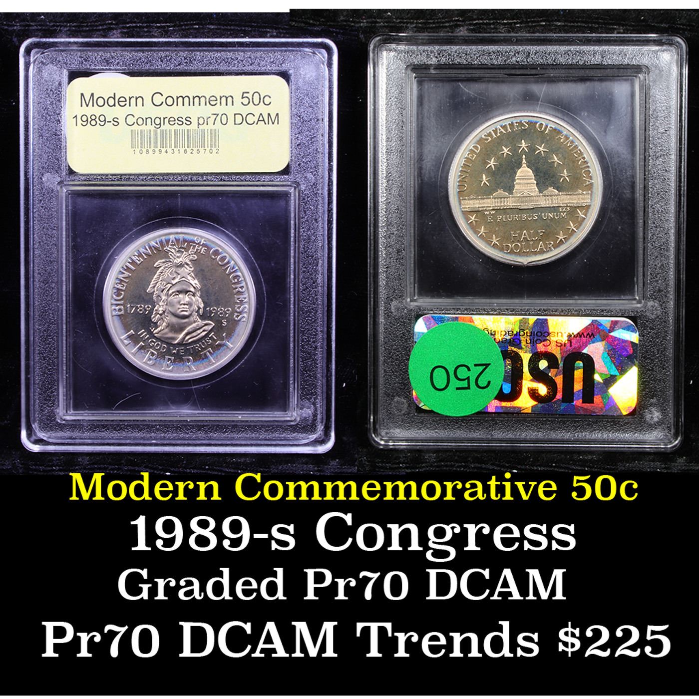 1989-S Congress Modern Commem Half Dollar 50c Graded GEM++ Proof Deep Cameo By USCG. The 1989 Congress Bicentennial Commemorative Half Dollar was one of three coins released to celebrate the 200th anniversary of Congress. The legislative body had first convened under the US Constitution in 1789 in Philadelphia. Certified and Graded PR70 Deep Cameo by USCG.