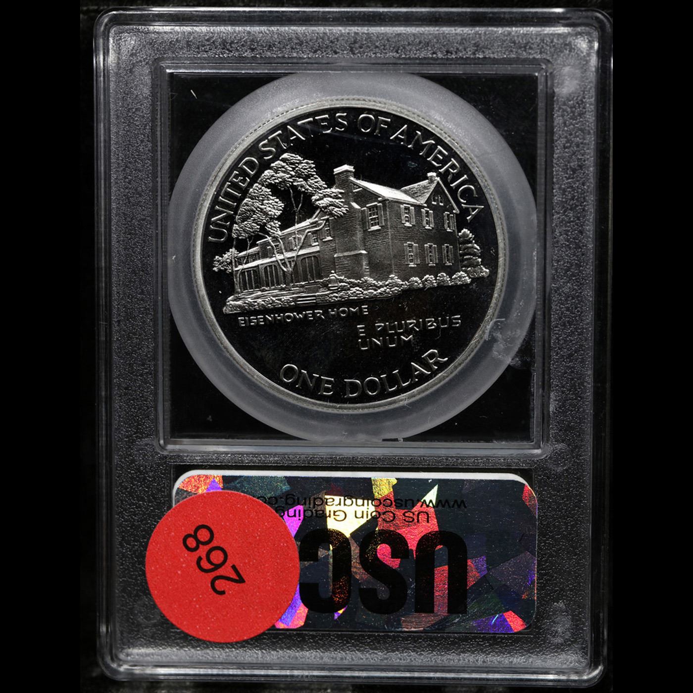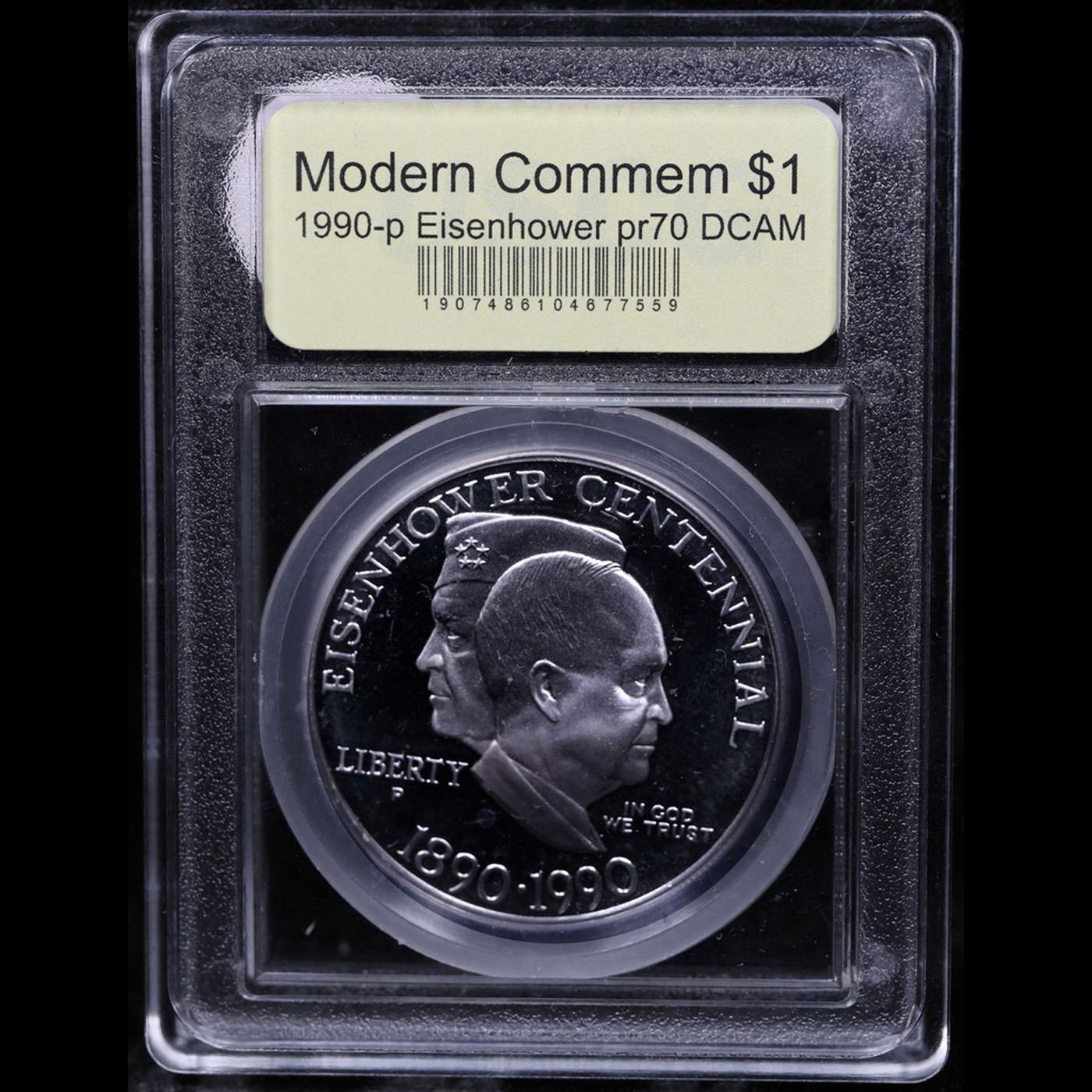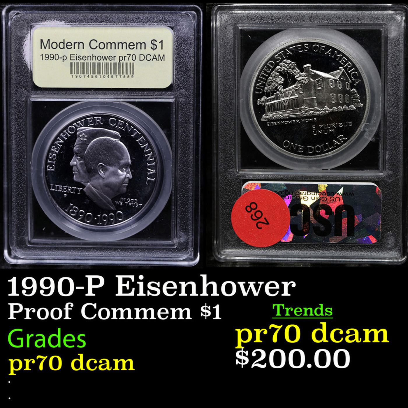 . 1990-P Eisenhower Modern Commem Dollar $1 Graded GEM++ Proof Deep Cameo By USCG. The 1990 Eisenhower Centennial Commemorative Silver Dollar was issued to mark the 100th anniversary of the birth of Dwight D. Eisenhower on October 14, 1890. The coin honors him as a Five Star General and the 34th President of the United States. This is the only US coin to feature two portraits of the same person on the same side of the coin. This example was graded Perfection PR70 DCAM.