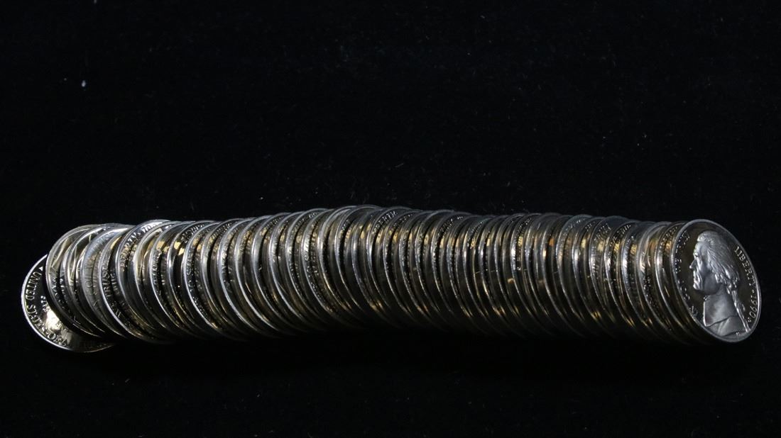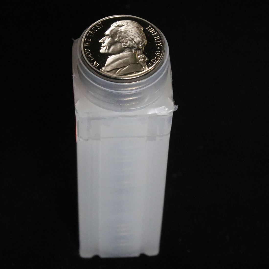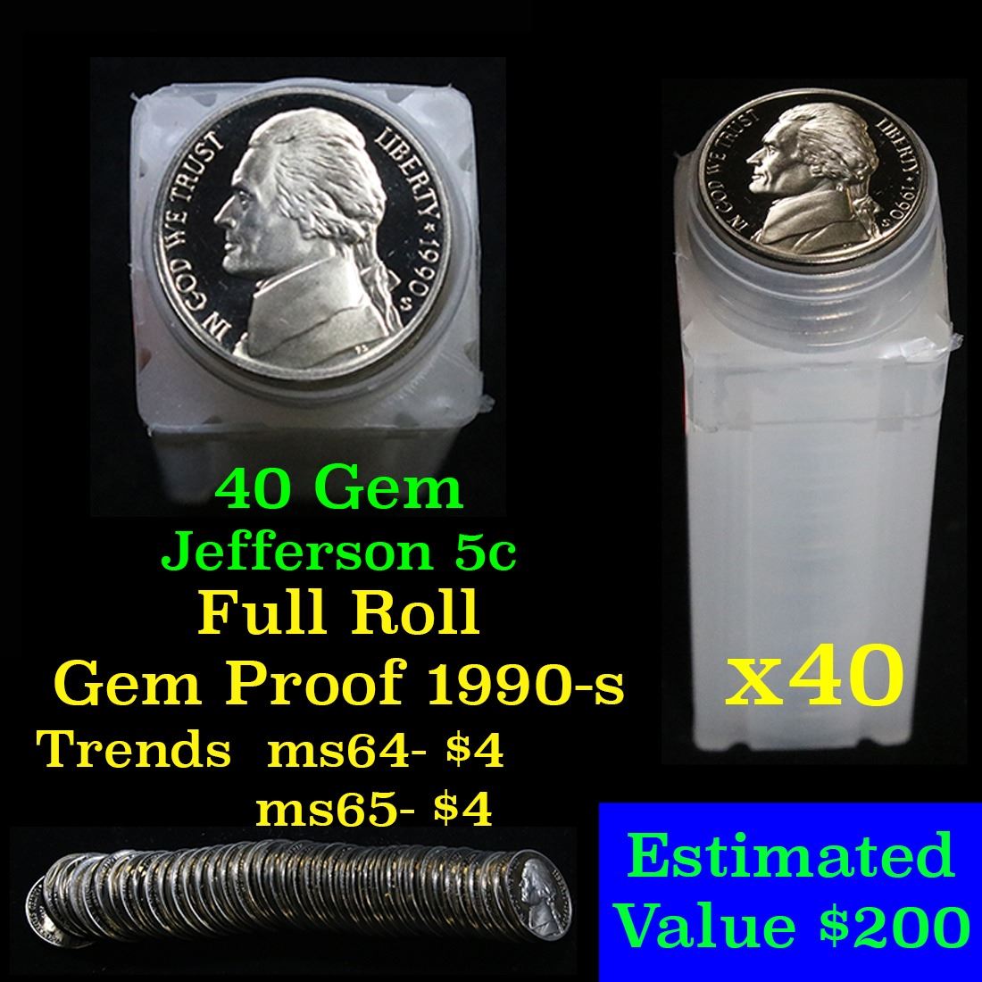 Proof 1990-s Jefferson nickel 5c roll, 40 pieces (fc). A great proof roll of Jefferson nickels. All coins are deep cameo. In pr65dcam, it trends $6/coin, $240.