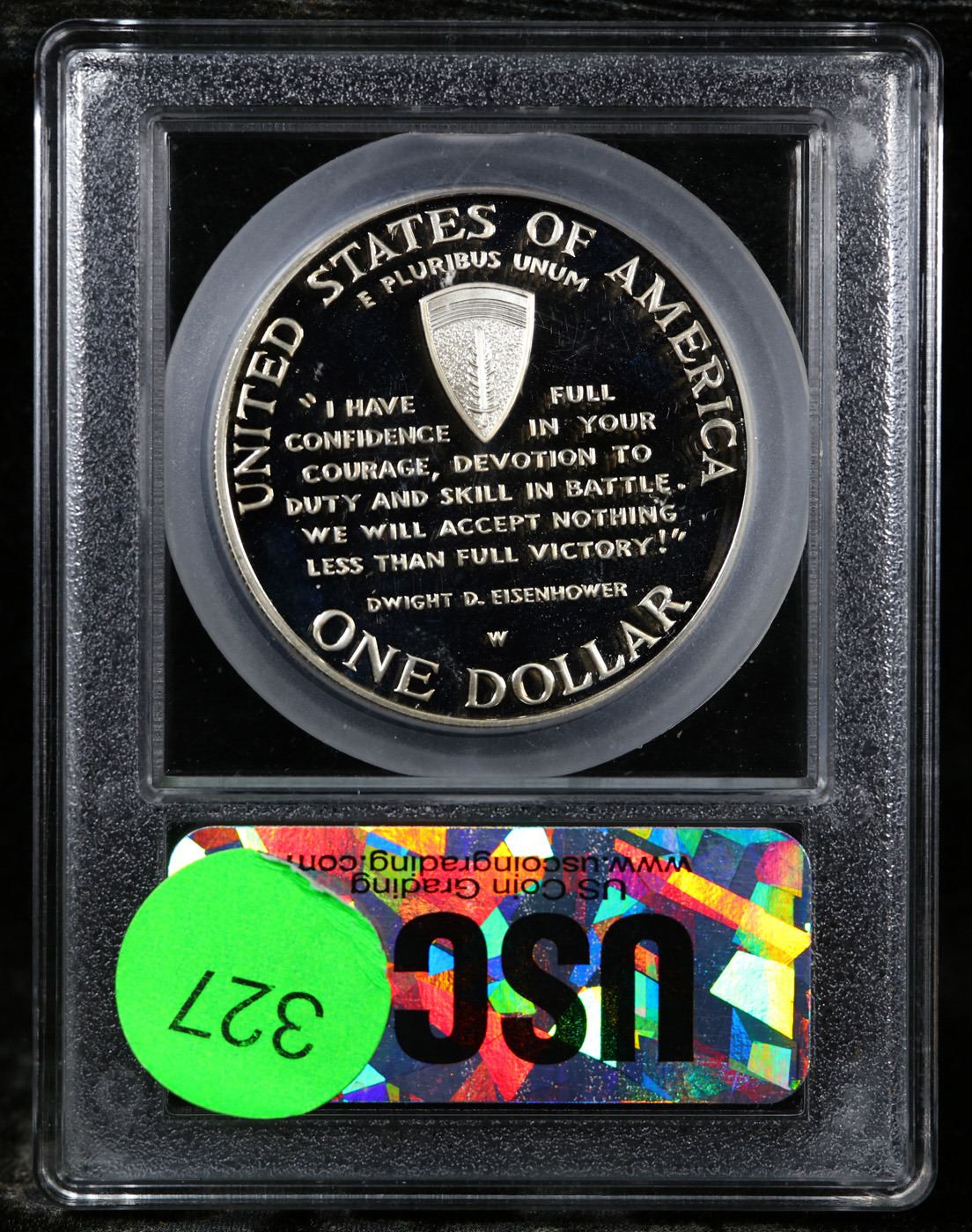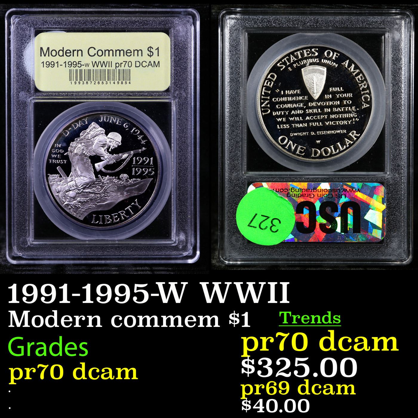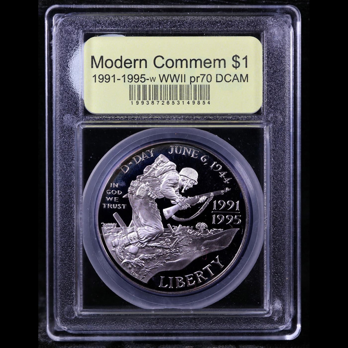 1991-1995-W WWII Modern Commem Dollar $1 Graded GEM++ Proof Deep Cameo By USCG. This Commemorative was released in 1993 and bears the dates 1991 and 1995 which signifies the 50th anniversary of WWII. This perfect example was certified as Pefection Deep Cameo by USCG.