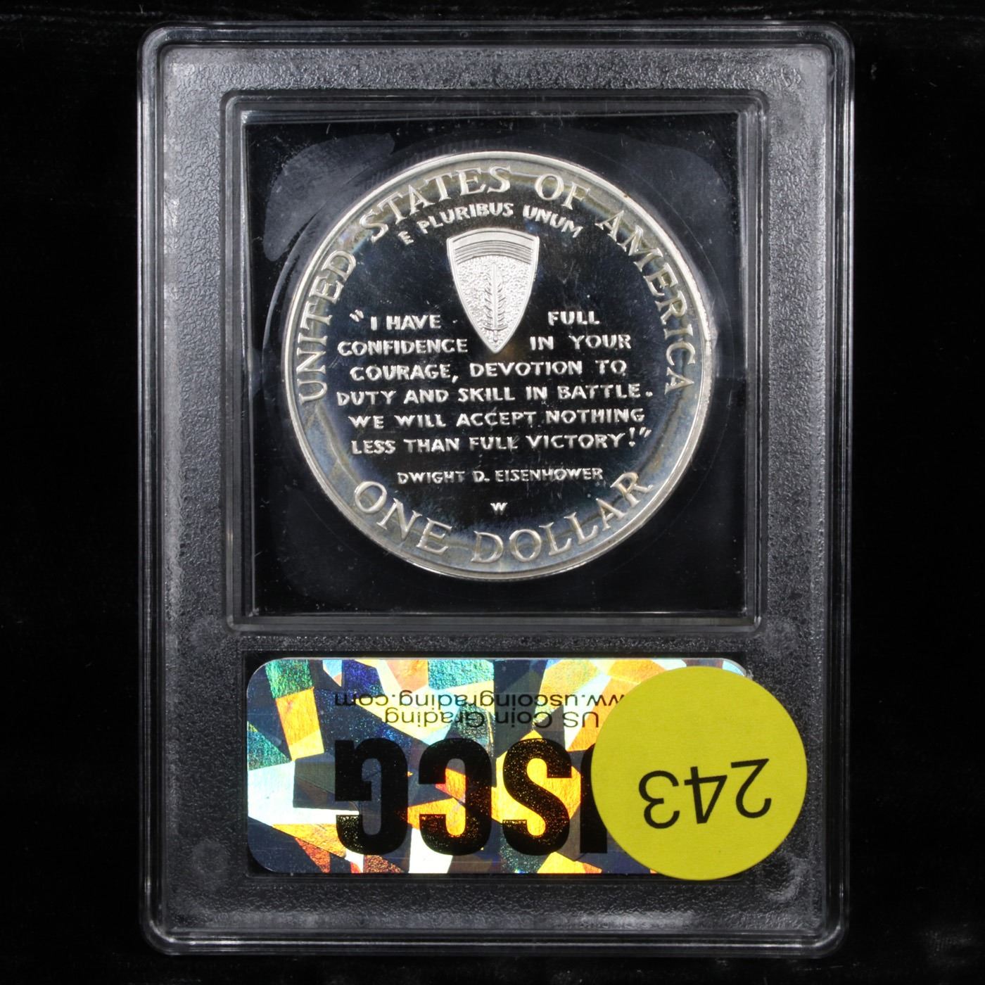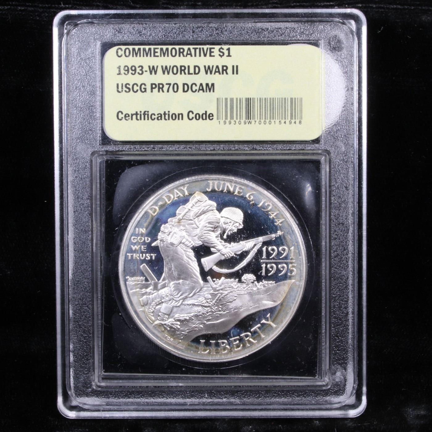 1991-1995-w WWII Modern Commem Dollar $1 Graded GEM++ Proof Deep Cameo By USCG. The Commemorative was released in 1993 and bears the dates 1991 and 1995 which signifies the 50th anniversary of WWII. This perfect example was certified as PR70 Deep Cameo by USCG.