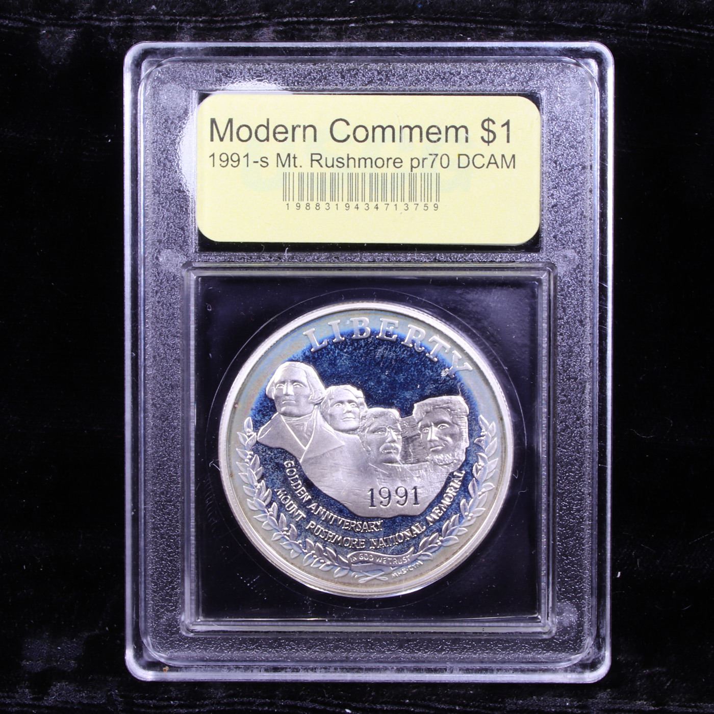 1991-S Mount Rushmore Modern Commem Dollar $1 Graded GEM++ Proof Deep Cameo By USCG. This commemorative was Issued to celebrate the Golden Anniversary of The completion of Mount Rushmore. This coin is Graded perfect PR70 Deep Cameo by USCG.