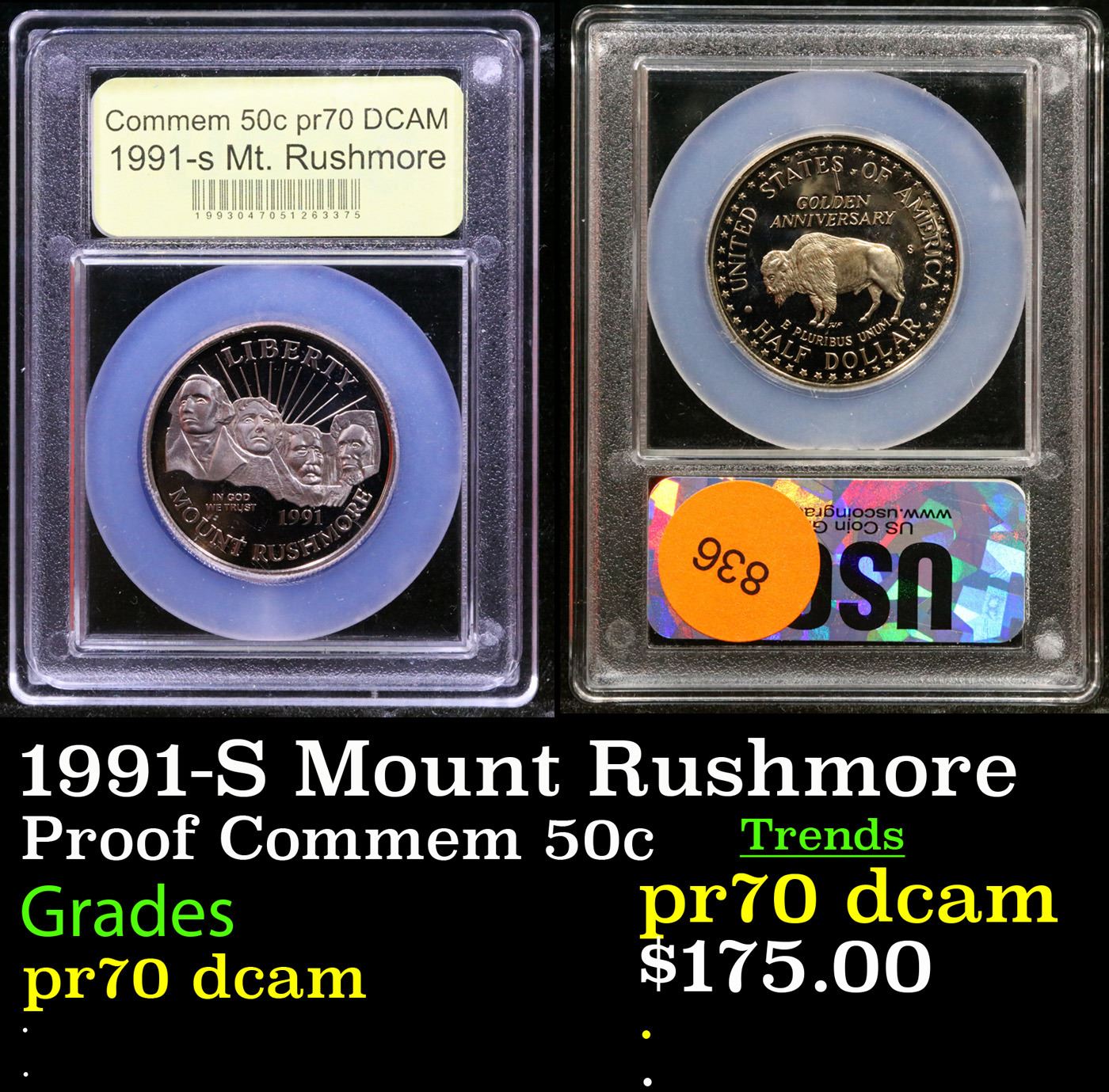 1991-S Mount Rushmore Modern Commem Half Dollar 50c Graded GEM++ Proof Deep Cameo By USCG. Issued to celebrate the Golden Anniversary of The completion of Mount Rushmore. This coin is Graded perfect PR70 Deep Cameo by USCG.