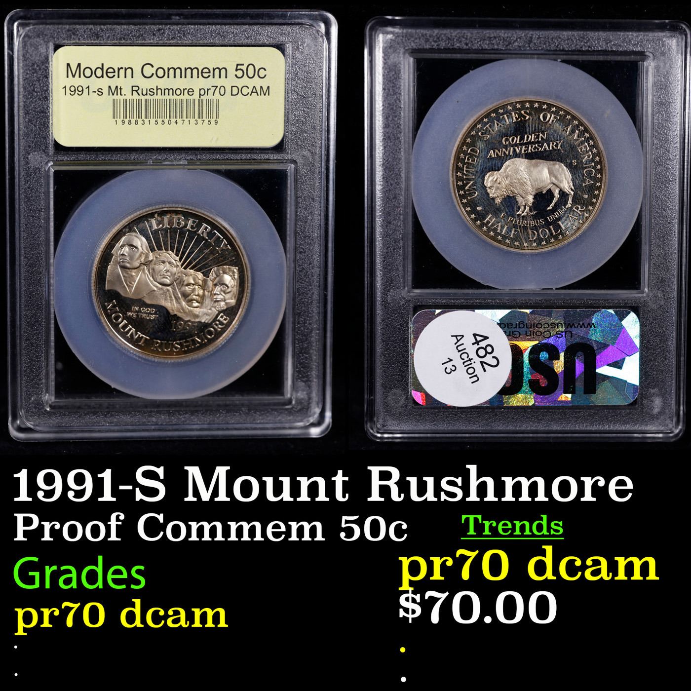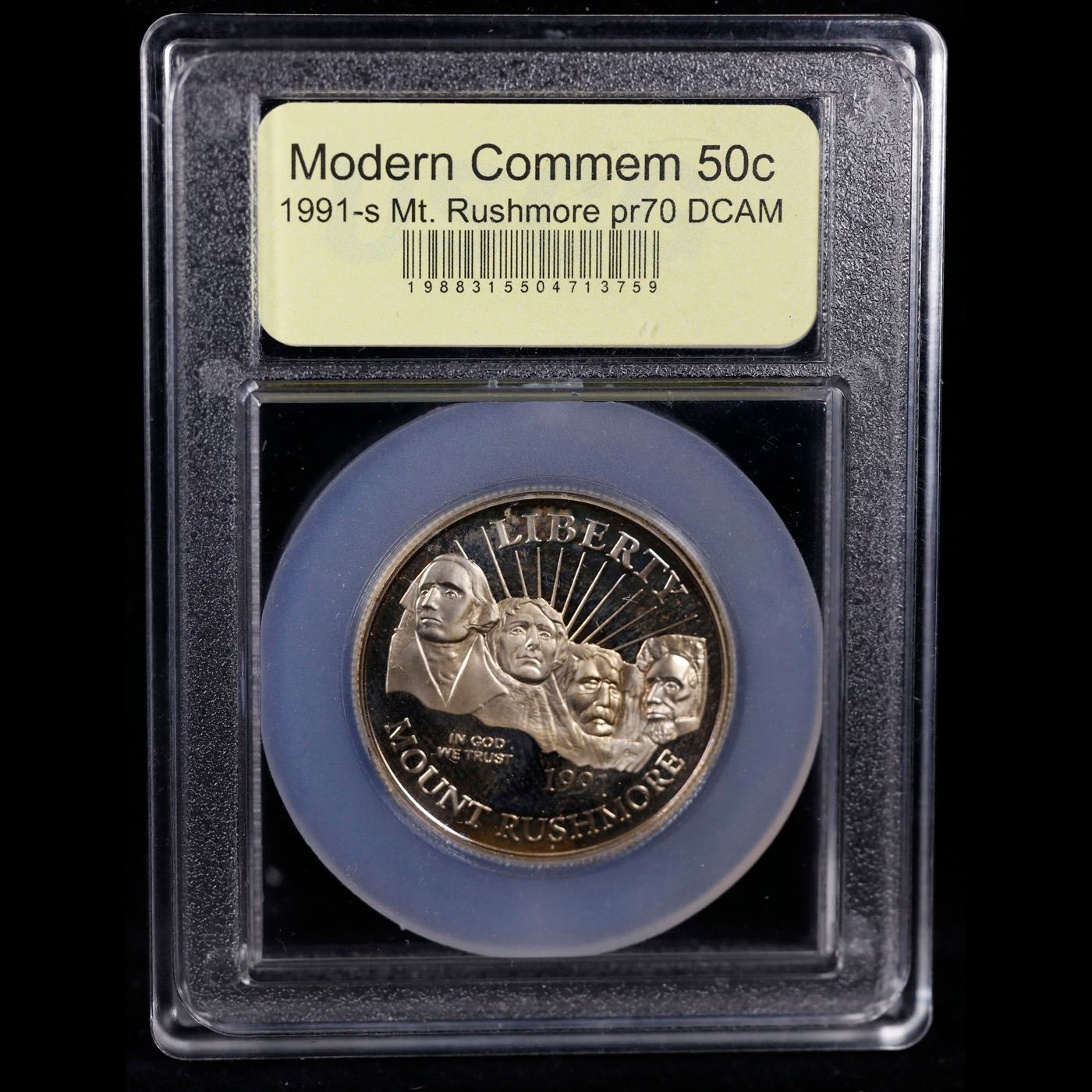 1991-S Mount Rushmore Modern Commem Half Dollar 50c Graded GEM++ Proof Deep Cameo By USCG. Issued to celebrate the Golden Anniversary of Mount Rushmore. A perfect Proof Example. Graded PR70 DCAM by USCG.