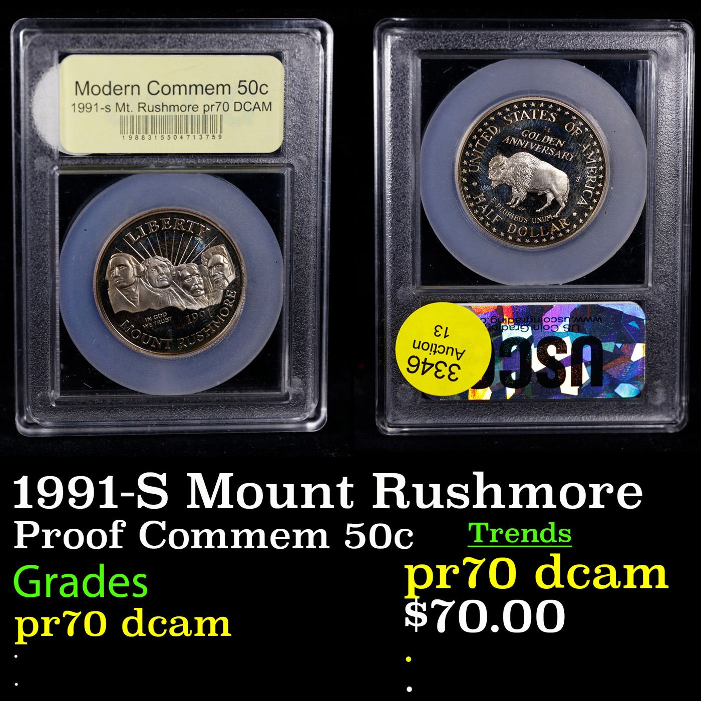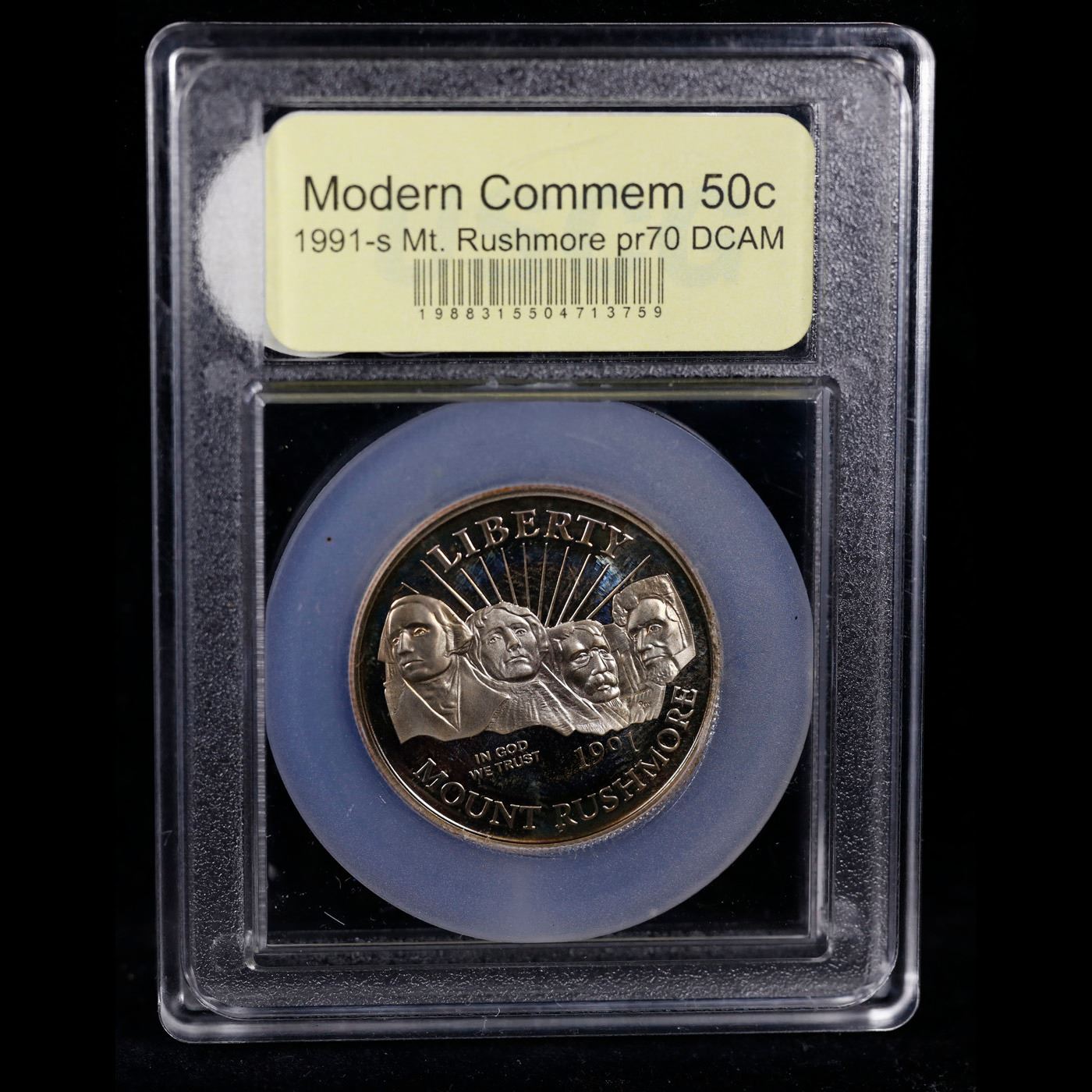 1991-S Mount Rushmore Modern Commem Half Dollar 50c Graded GEM++ Proof Deep Cameo By USCG. Issued to celebrate the Golden Anniversary of Mount Rushmore. A perfect Proof Example. Graded PR70 DCAM by USCG.
