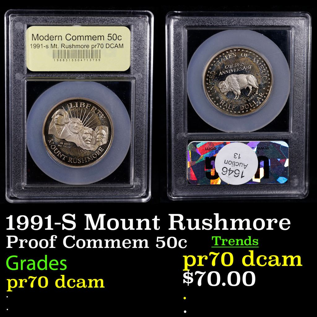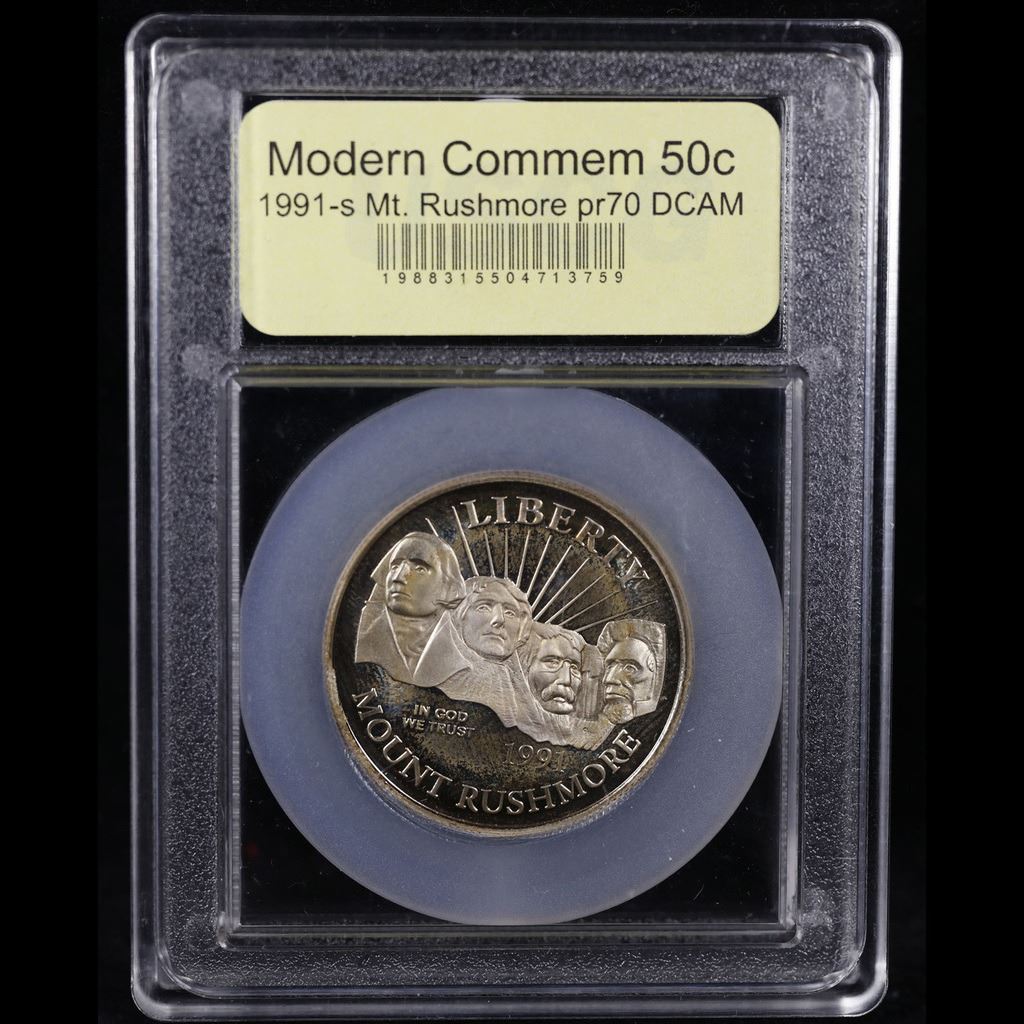 1991-S Mount Rushmore Modern Commem Half Dollar 50c Graded GEM++ Proof Deep Cameo By USCG. Issued to celebrate the Golden Anniversary of Mount Rushmore. A perfect Proof Example. Graded PR70 DCAM by USCG.