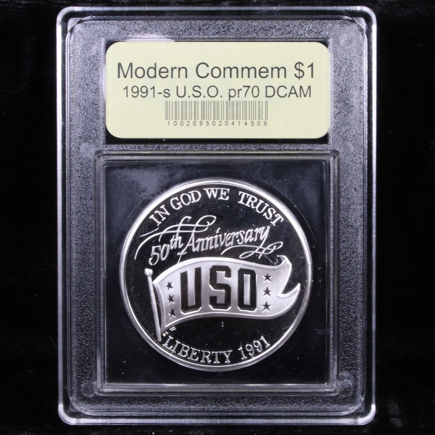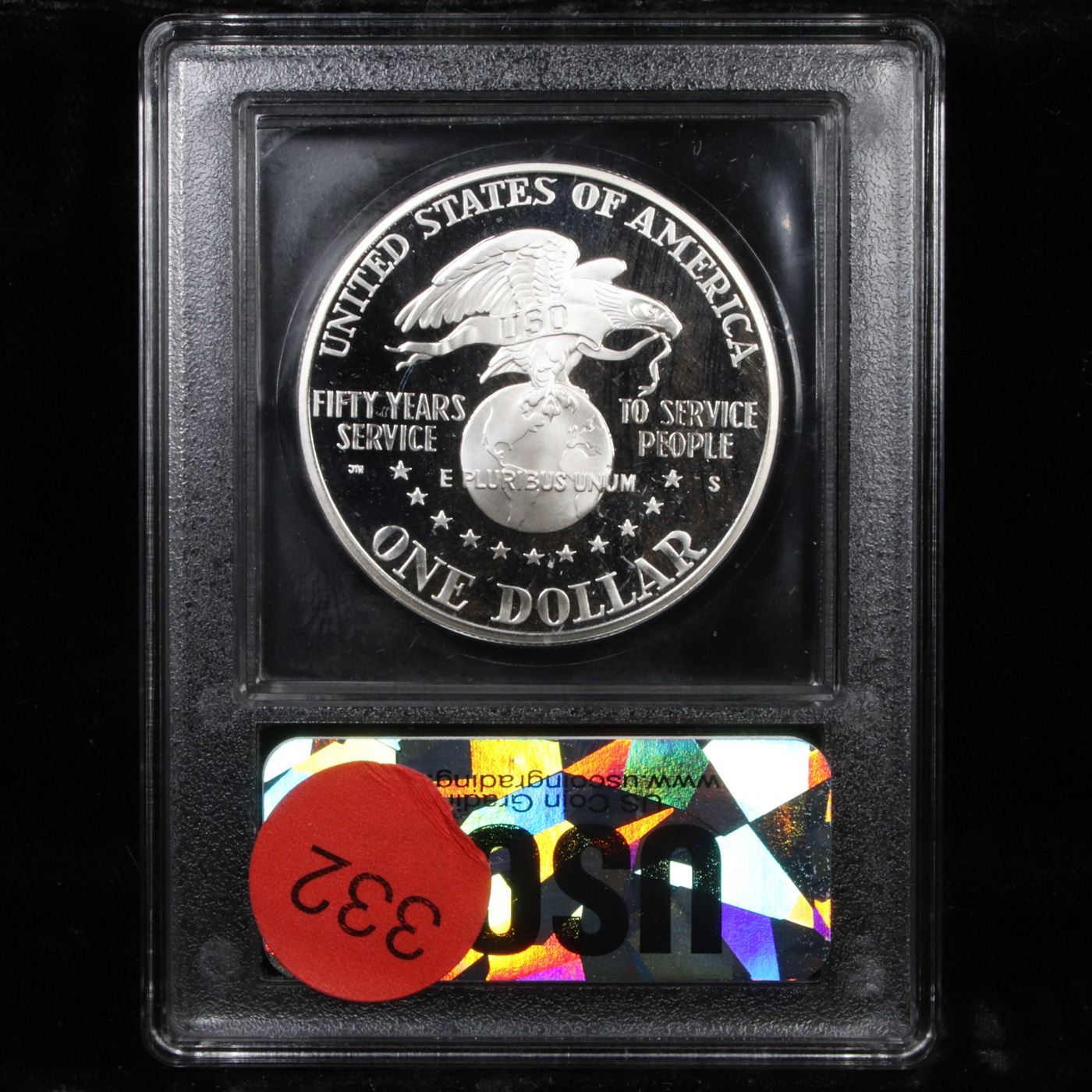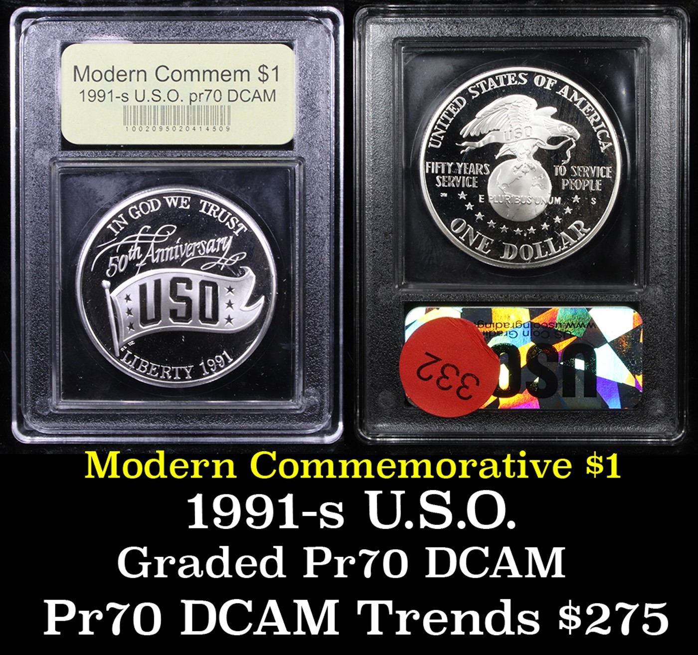 1991-S USO Modern Commem Dollar $1 Graded GEM++ Proof Deep Cameo By USCG. The 1991 USO Silver Dollar was released to mark the 50th anniversary of the United Service Organization. Encapsulated and Graded PR70 DCAM by USCG.