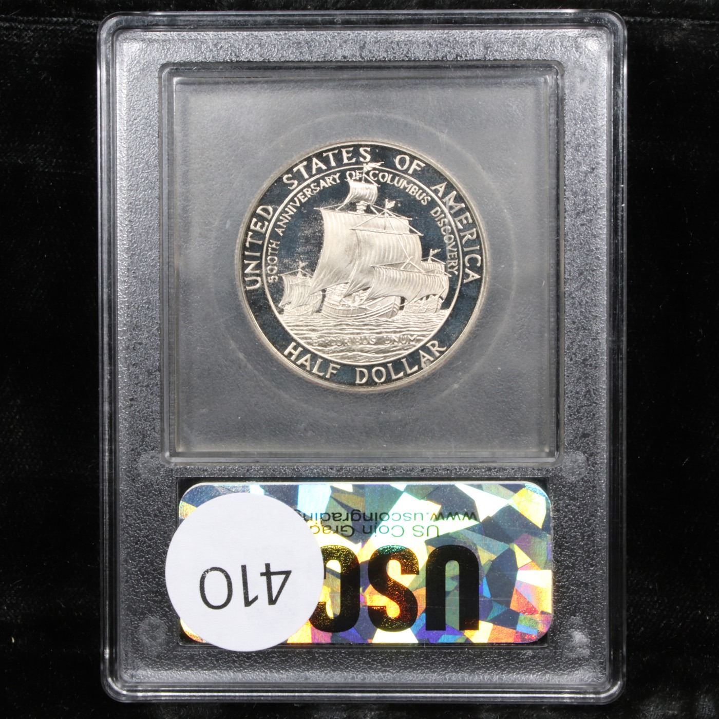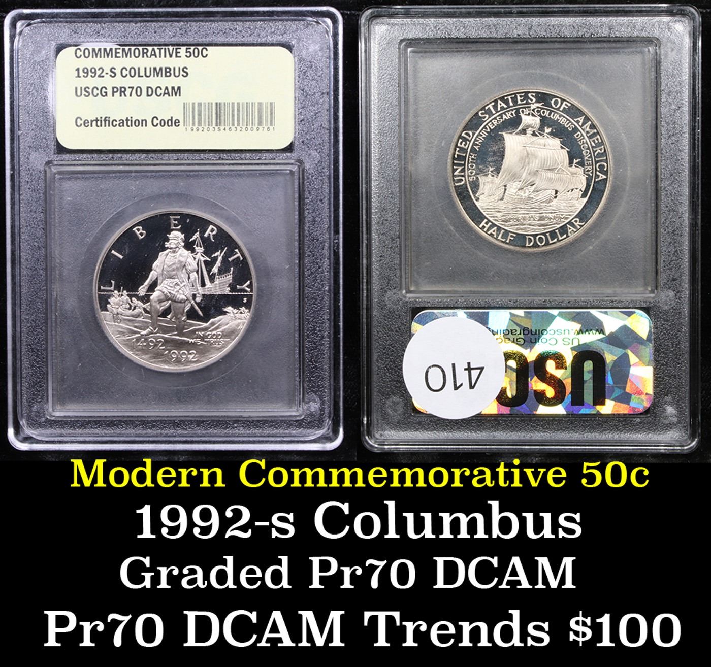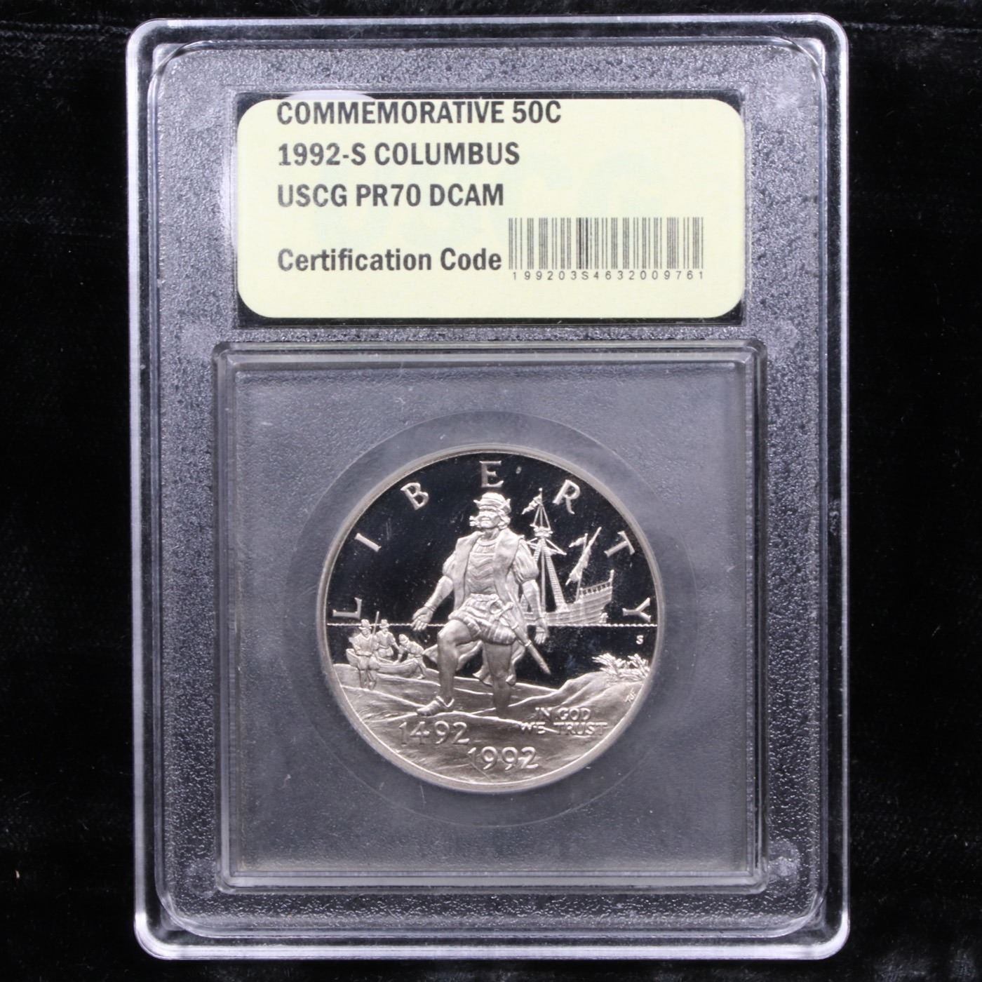 1992-S Columbus Modern Commem Half Dollar 50c Graded GEM++ Proof Deep Cameo By USCG. This very special Commemorative was issued to mark the 500th anniversary or quincentenary of the discovery of the Americas by Christopher Columbus. One Hundred years earlier in 1892 America issued a similar commemorative Half Dollar, our first half Dollar Commemorative, which honored the 400th Anniversary. A very significant Issue. This proof half dollar is graded PR70 DCAM by USCG.