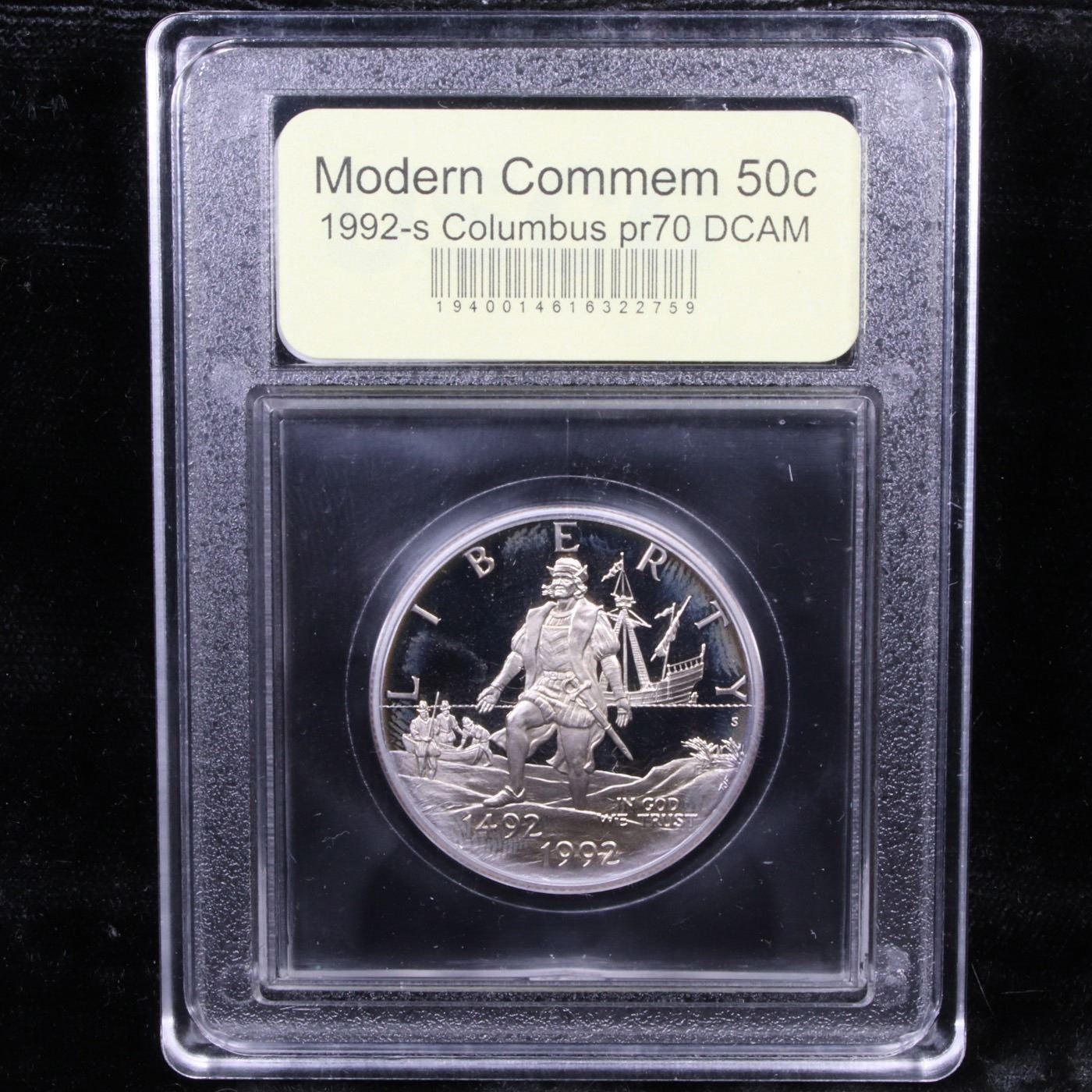 1992-S Columbus Modern Commem Half Dollar 50c Grades GEM++ Proof Deep Cameo. This very special Commemorative was issued to mark the 500th anniversary or quincentenary of the discovery of the Americas by Christopher Columbus. One Hundred years earlier in 1892 America issued a similar commemorative Half Dollar, our first half Dollar Commemorative, which honored the 400th Anniversary. A very significant Issue. This proof half dollar is graded PR70 DCAM by USCG. Estimated Value $125