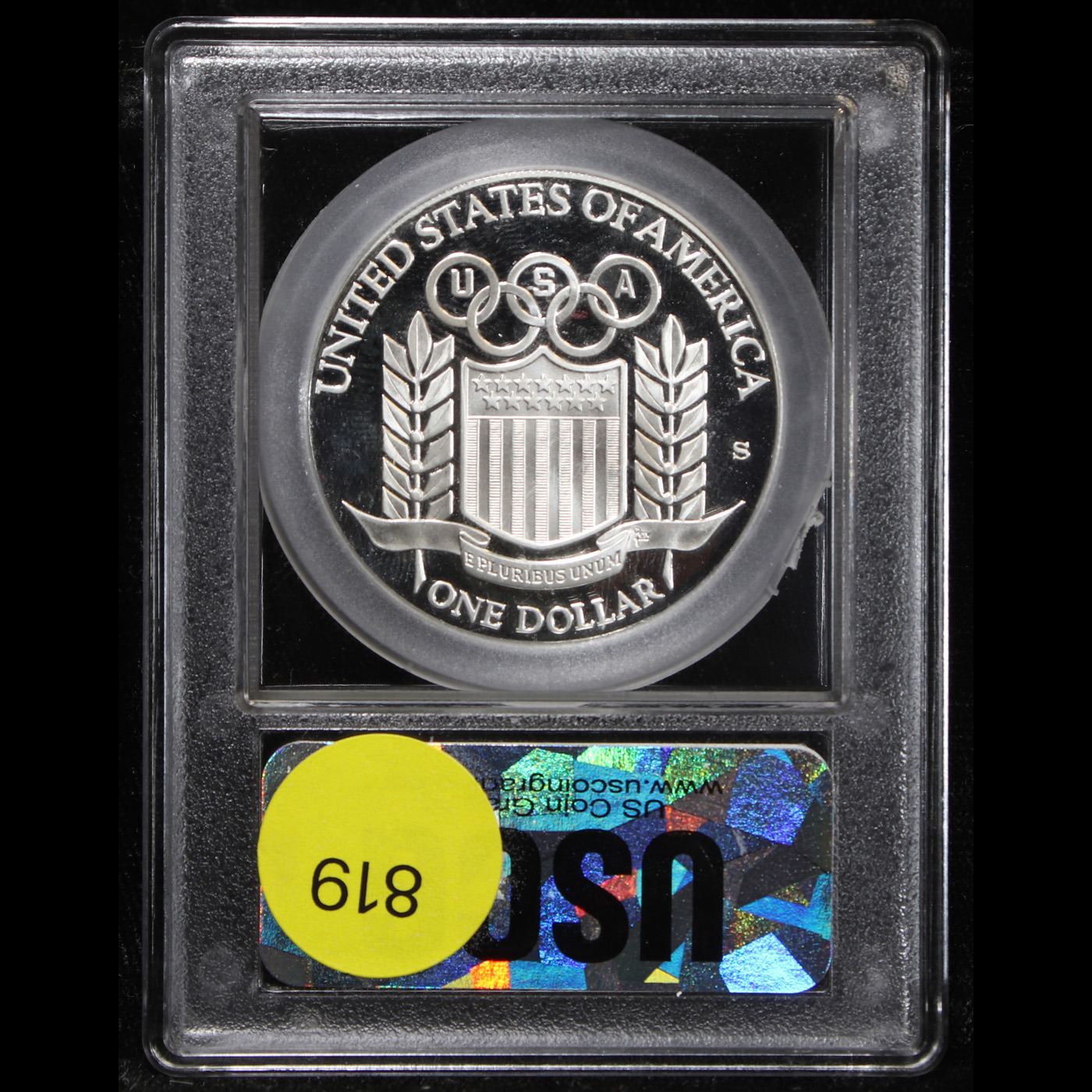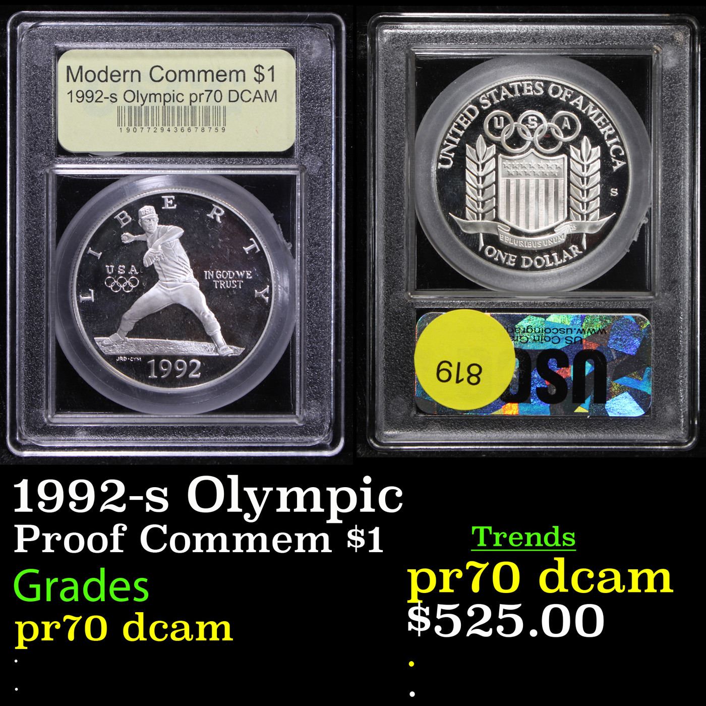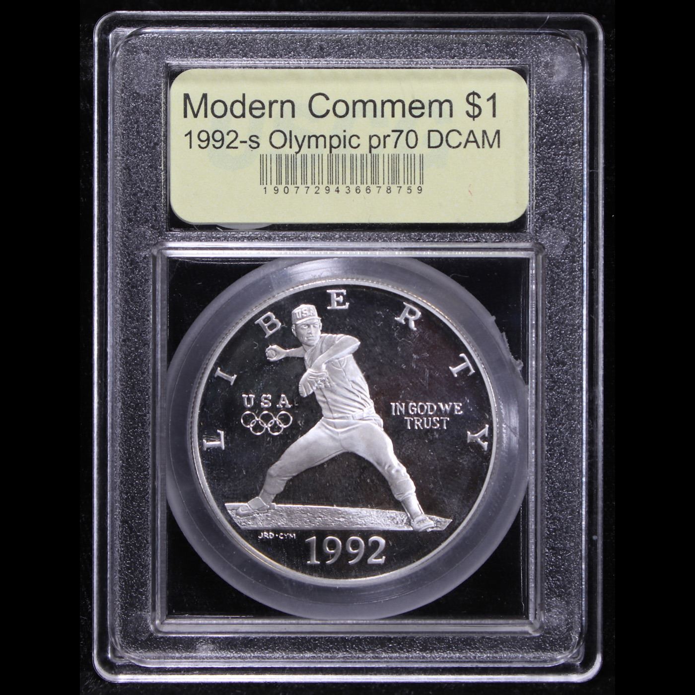 1992-s Olympic Modern Commem Dollar $1 Graded GEM++ Proof Deep Cameo By USCG. The 1992 Olympic Silver Dollar was issued for the XXV Olympic Games. The 1992 Olympic Silver Dollar Commemorative coin features a baseball player throwing a pitch. Although it is very similar to an image of Nolan Ryan which appeared on a Fleer baseball card. The designer of the coin John R. Deecken denied that there was any connection. This coin is graded PR70 DCAM by USCG.