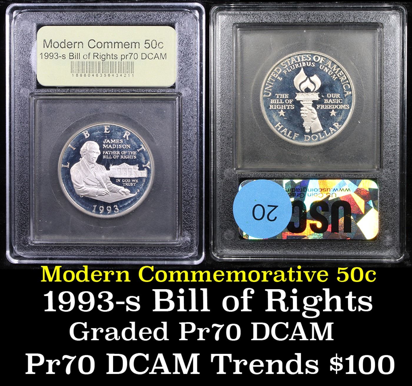 1993-s Bill of Rights Modern Commem Half Dollar 50c Graded GEM++ Proof Deep Cameo By USCG. This Proof Half Dollar Coin Commemorates James Madison and the Bill of Rights. This Example was Graded Perfection Gem+++ Proof Deep Cameo by USCG.