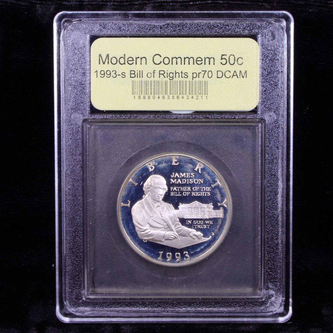 1993-s Bill of Rights Modern Commem Half Dollar 50c Graded GEM++ Proof Deep Cameo By USCG. One of only 2 modern commemorative half dollars to be struck in silver. Just this and the George Washington half have been struck in silver. This coin commemorates James Madison and the Bill of Rights. This Proof Commemorative Half Dollar is Graded PR70 Deep Cameo by USCG.