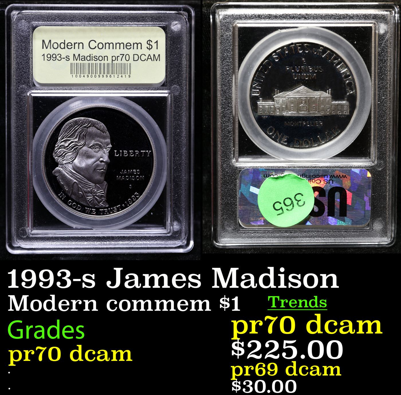 1993-s James Madison Modern Commem Dollar $1 Graded GEM++ Proof Deep Cameo By USCG. The 1993 James Madison Silver Dollar was Issued in honor of James Madison and the Bill of Rights which he authored.