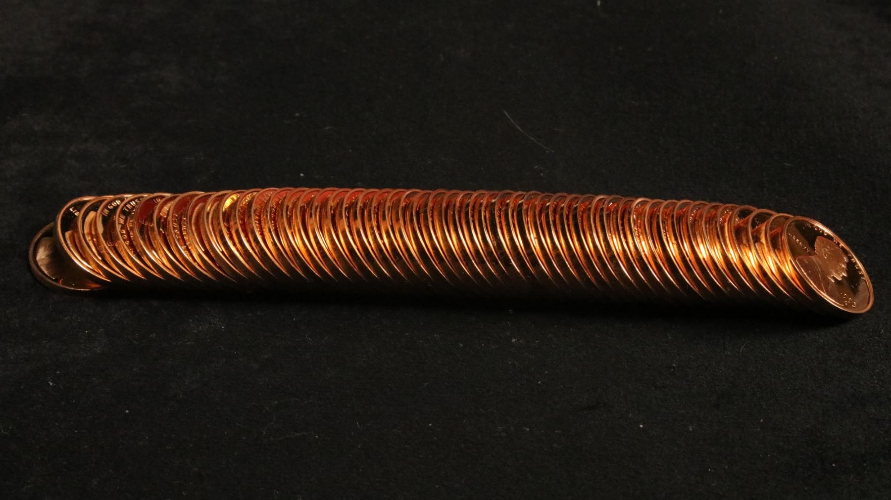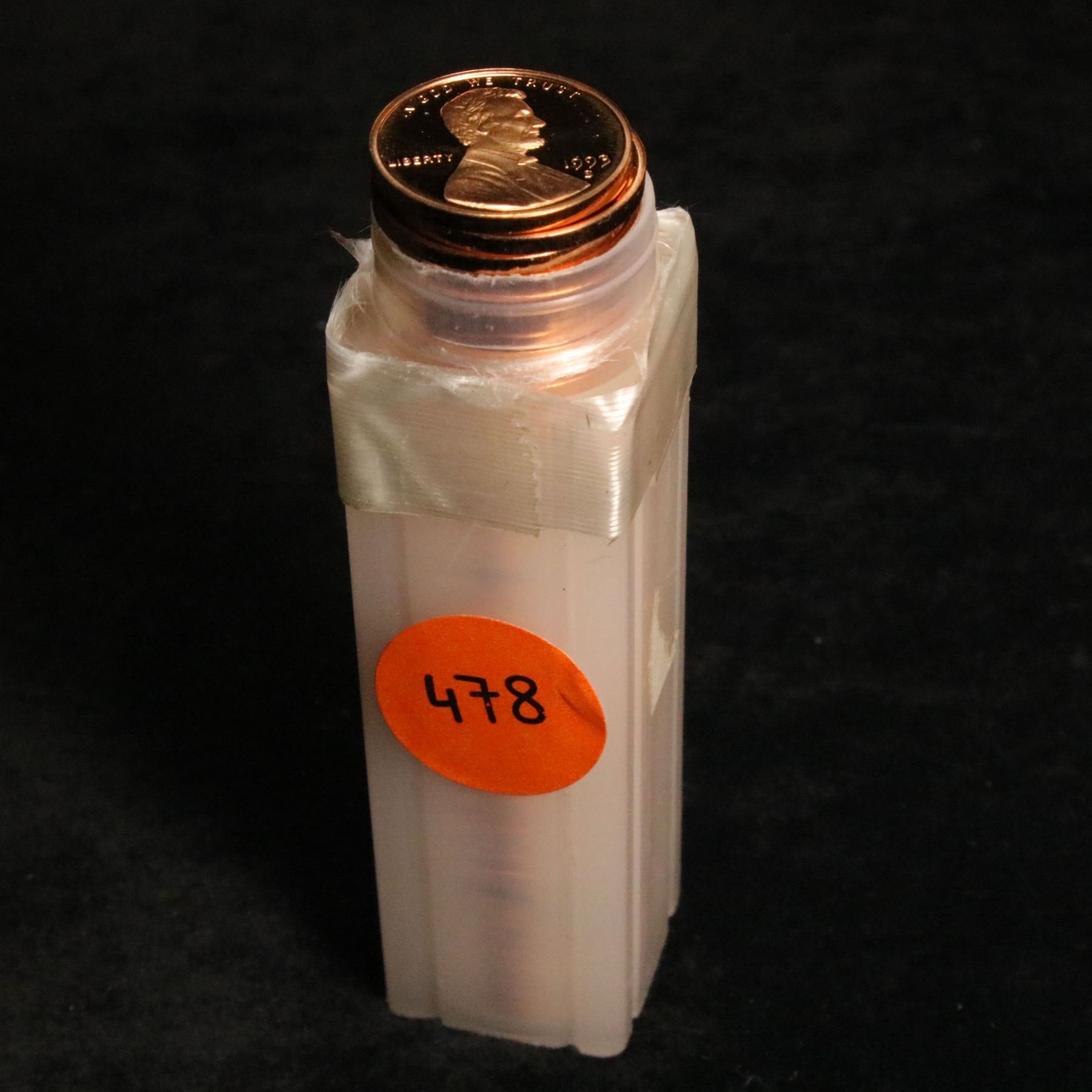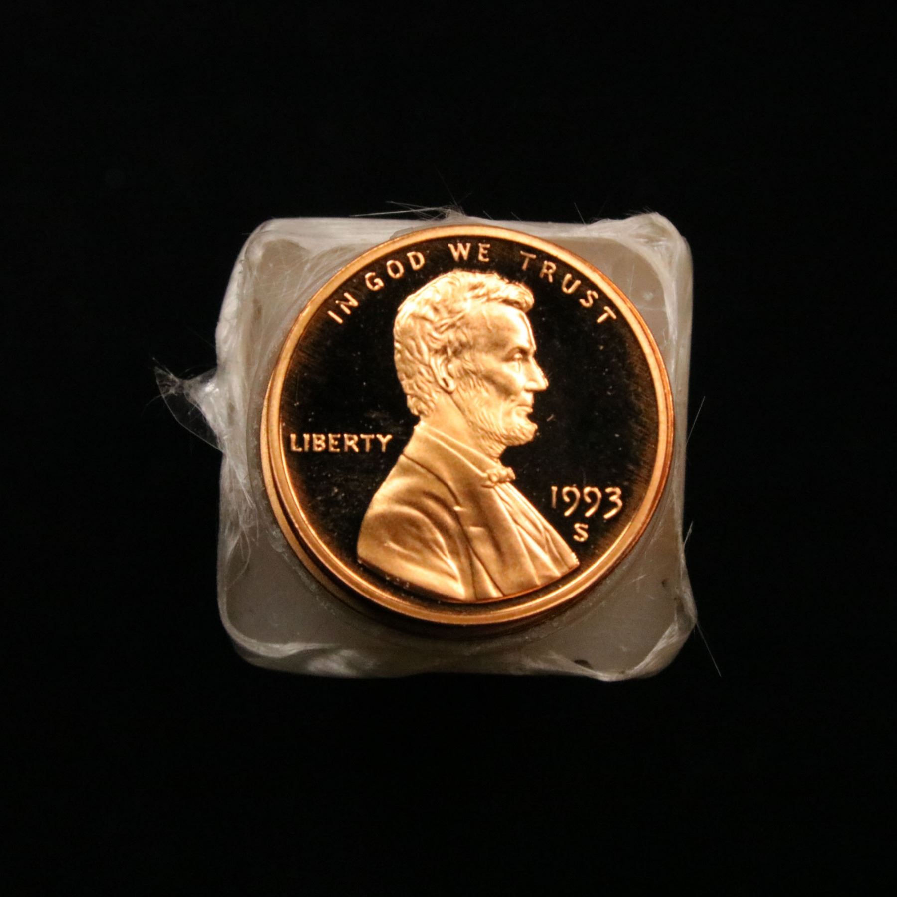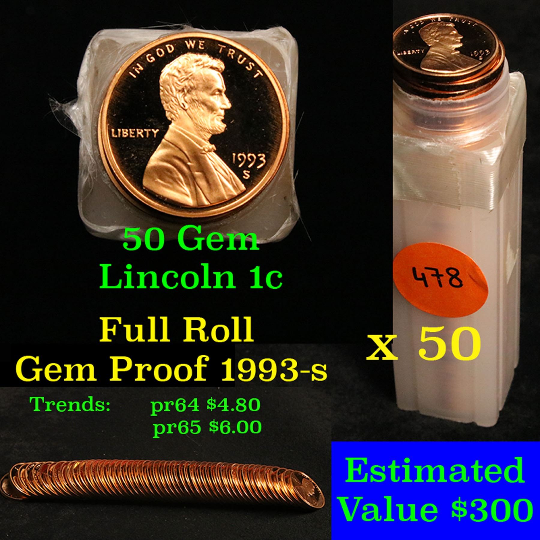 Proof 1993-s Lincoln cent 1c roll, 50 pieces (fc). A terrific proof roll of Lincoln cents. All red, and deep cameo. Trends pr65rd dcam is $6/coin, $300