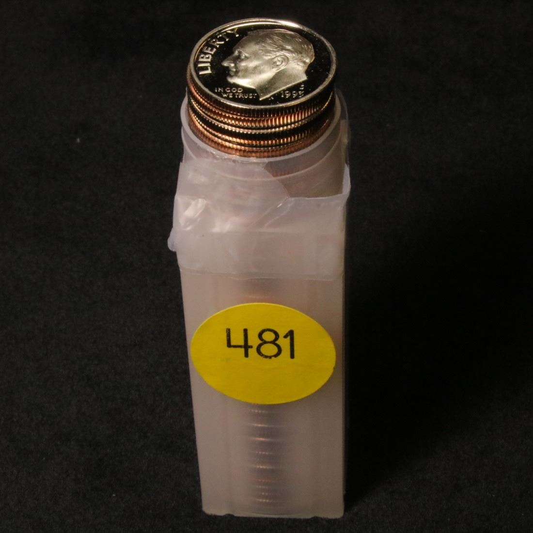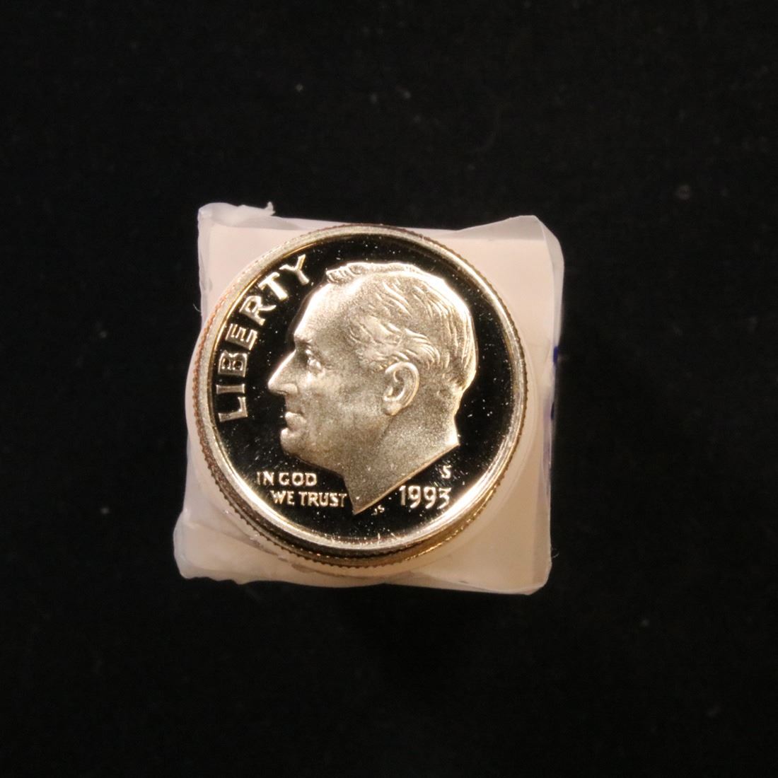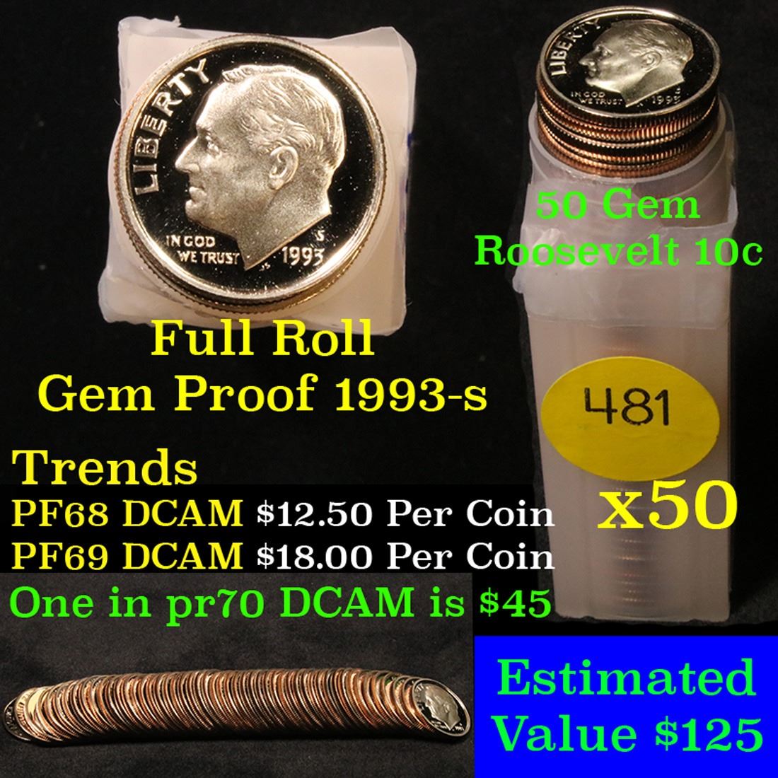 Proof 1993-s Roosevelt Dime 10c roll, 50 pieces (fc). A great roll of proof Roosevelt dimes. Some cameo's and deep cameo's. Pr65 dCam trends $8.50/coin, $425