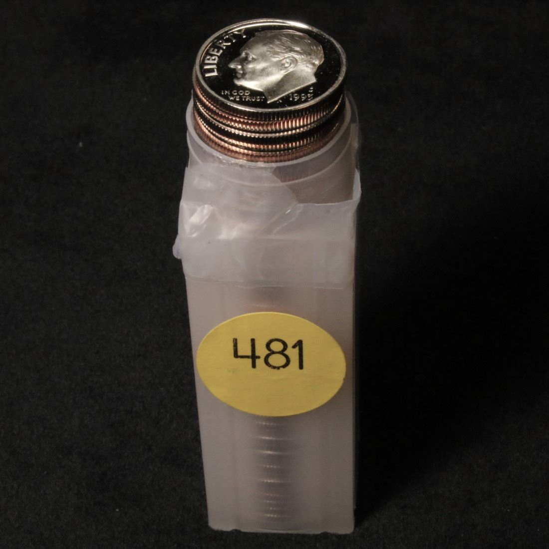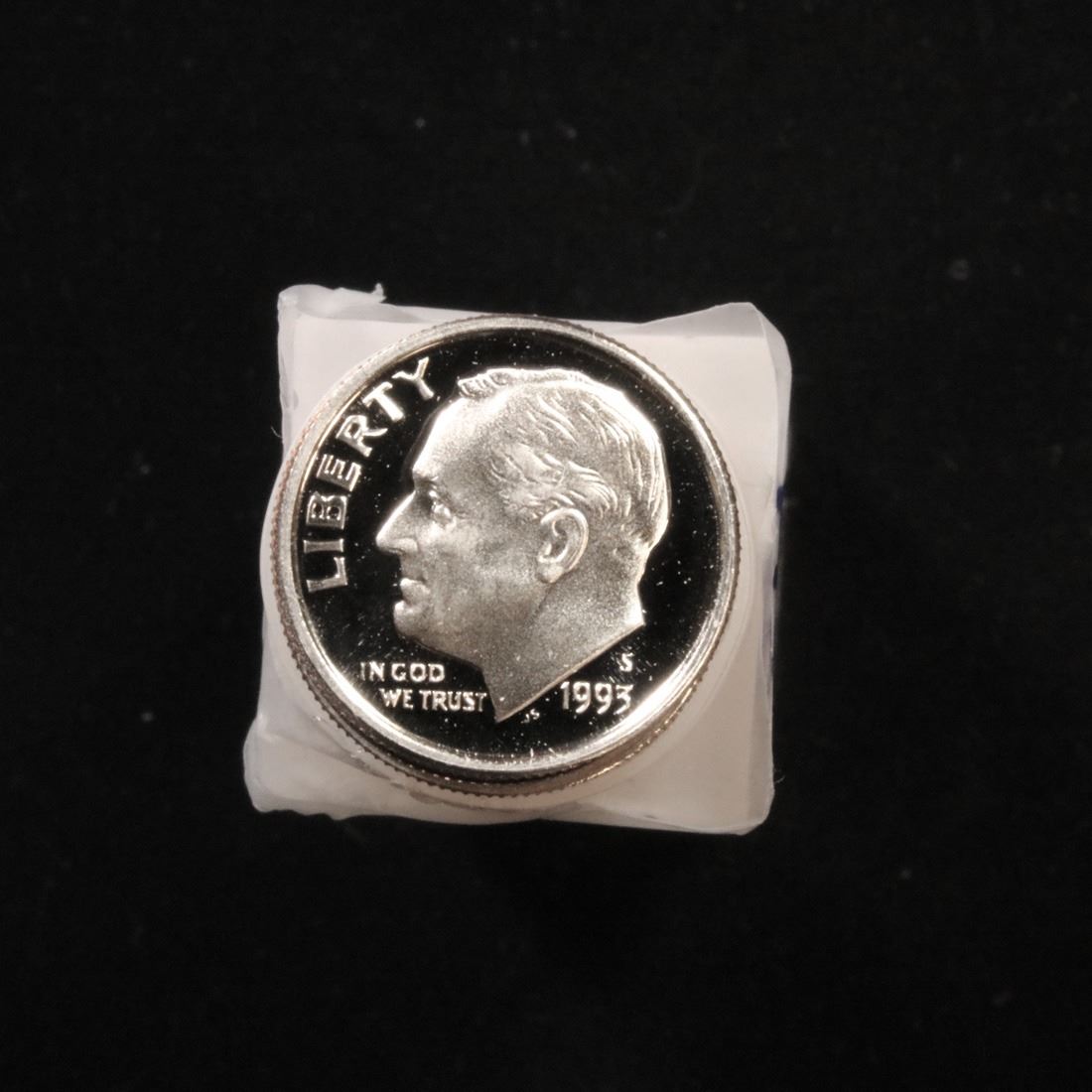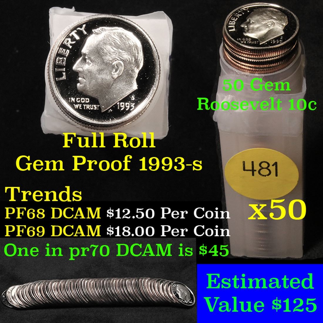 Proof 1993-s Roosevelt Dime 10c roll, 50 pieces (fc). A great roll of proof Roosevelt dimes. Some cameo's and deep cameo's. pr65Cam trends $6/coin, $300