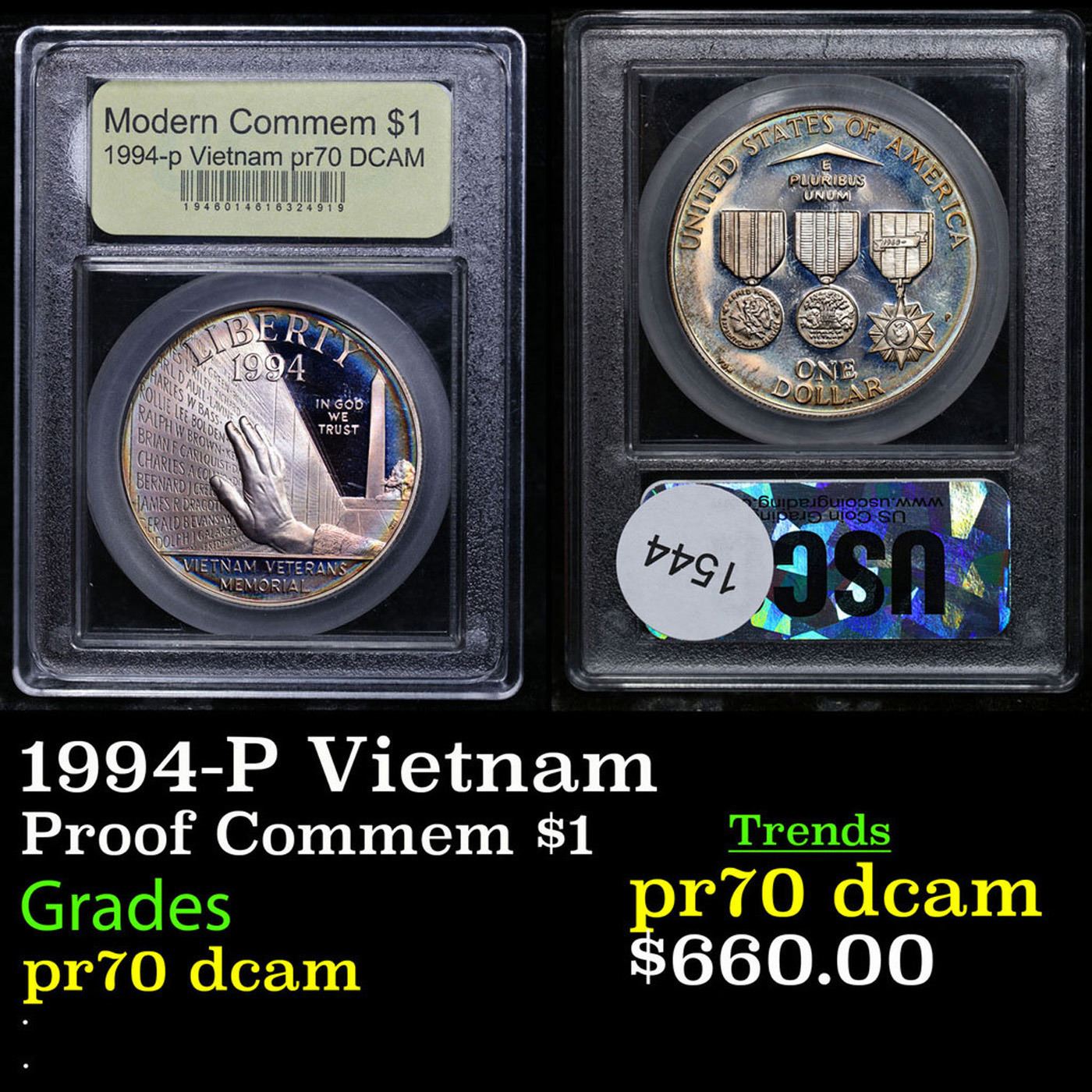 . 1994-P Vietnam Modern Commem Dollar $1 Graded GEM++ Proof Deep Cameo By USCG. The 1994 Vietnam Veterans Memorial Silver Dollar was issued to mark the 10th anniversary of the dedication of the Vietnam Veterans Memorial Wall in Washington, DC. PCGS lists PR70 DCAM at $1700. This coin is graded PR70 DCAM by USCG.