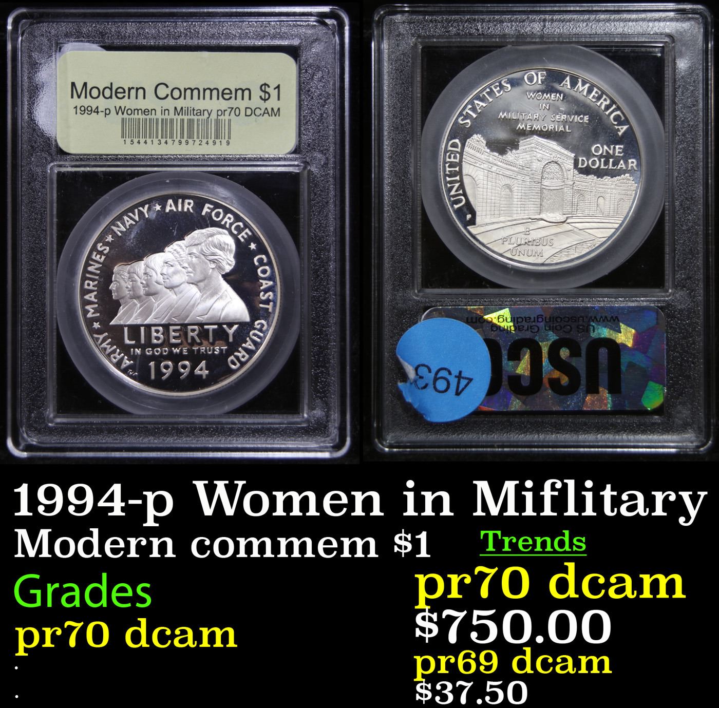 1994-p Women in Miflitary Modern Commem Dollar $1 Graded GEM++ Proof Deep Cameo By USCG. The 1994 Women in Military Service Memorial Silver Dollar was issued for the construction of a new memorial complex for women in military service. This coin is graded PR70 DCAM by USCG.