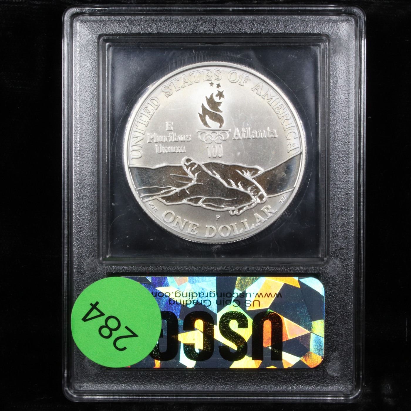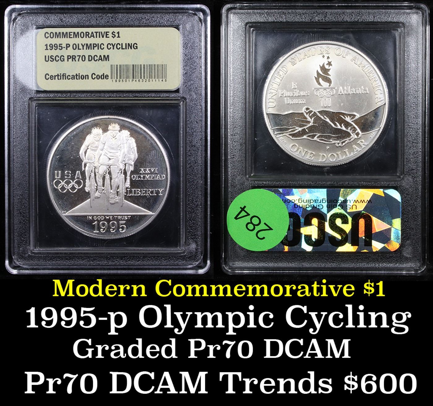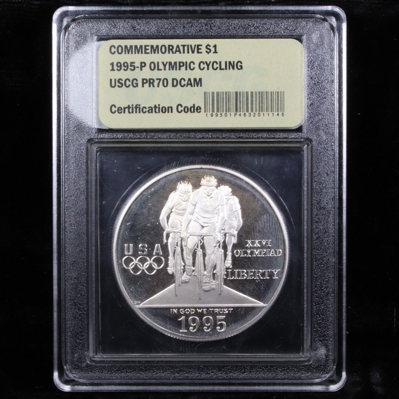 1995-P Olympics Cycling Modern Commem Dollar $1 Graded GEM++ Proof Deep Cameo By USCG. The 1995 Olympic Cycling Silver Dollar was issued as part of an extensive program of commemorative coins for the XXVI Olympiad held in Atlanta, Georgia. There were a total of sixteen different coins issued for the program over the course of two years.