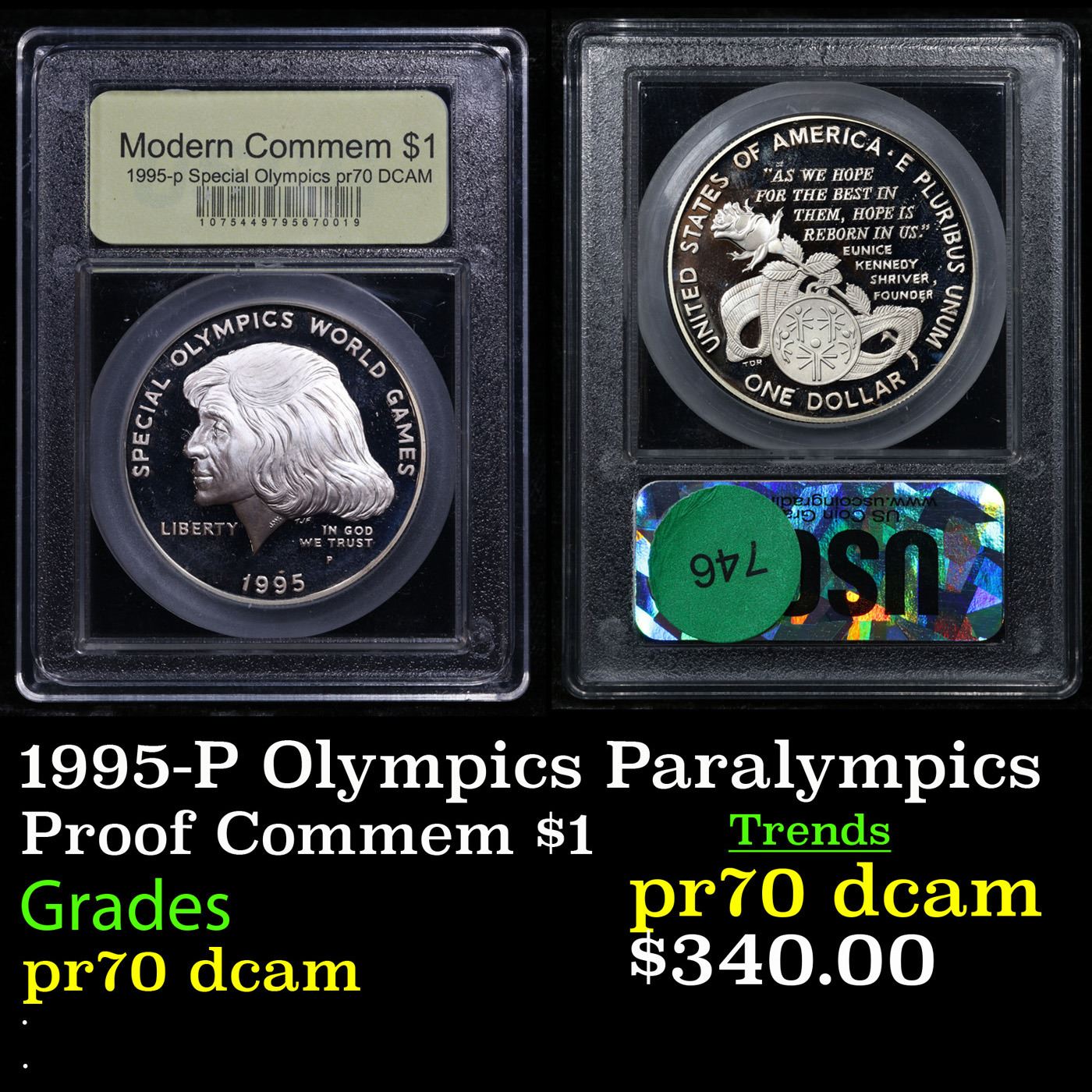 1995-P Olympics Paralympics Modern Commem Dollar $1 Graded GEM++ Proof Deep Cameo By USCG. The 1995 Paralympics Silver Dollar was issued as part of an extensive program of commemorative coins for the XXVI Olympiad held in Atlanta, Georgia. There were a total of sixteen different coins issued for the program over the course of two years. This Perfect coin is graded PR70 Deep cameo by USCG.