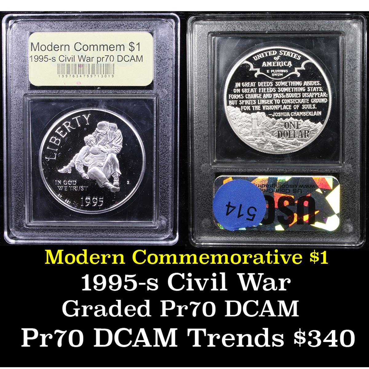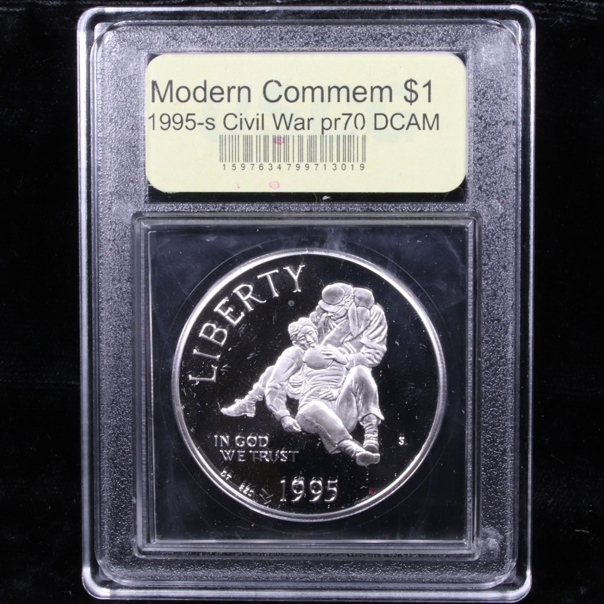 1995-S Civil War Modern Commem Dollar $1 Graded GEM++ Proof Deep Cameo By USCG. The 1995 Civil War Battlefields Silver Dollar was to commemorative 100 years of Civil War battlefields preservation. This is dated from the establishment of the Gettysburg National Military Park in 1895. Encapsulated and Graded PR70 DCAM by USCG. PCGS calls this coin Very Elusive.