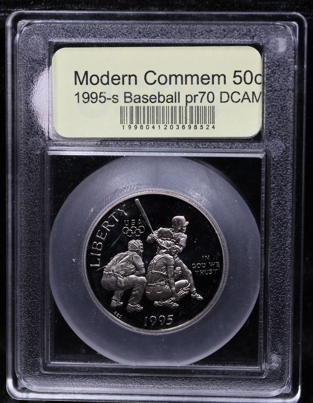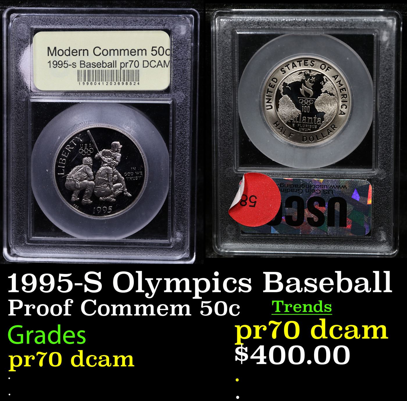 1995-S Olympics Baseball Modern Commem Half Dollar 50c Graded GEM++ Proof Deep Cameo By USCG. The 1995 Olympic Baseball Half Dollar was issued as one of two commemorative half dollar coins for the Atlanta XXVI Olympiad Summer Games. This example is Graded PR70 DCAM by USCG.