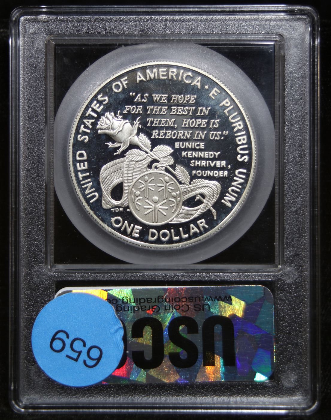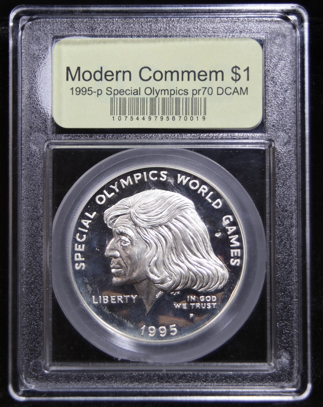 1995-p Special Olympics Modern Commem Dollar $1 Graded GEM++ Proof Deep Cameo By USCG. The 1995 Special Olympics World Games Silver Dollar was issued to honor the competitions created for people with intellectual disabilities. The obverse is a portrait of Eunice Kennedy Shriver. At the time, she was the first living female depicted on US coinage. This Perfect coin is graded PR70 DCAM by USCG.