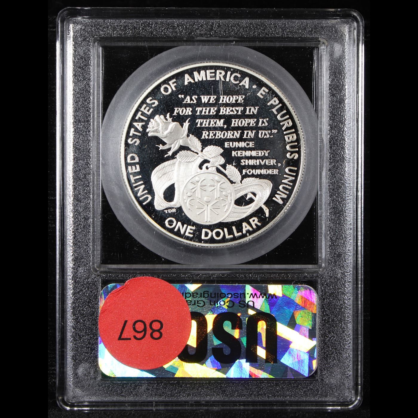 1995-p Special Olympics Modern Commem Dollar $1 Graded GEM++ Proof Deep Cameo by USCG. The 1995 Special Olympics World Games Silver Dollar was issued to honor the competitions created for people with intellectual disabilities. The obverse is a portrait of Eunice Kennedy Shriver. At the time, she was the first living female depicted on US coinage. This Perfect coin is graded PR70 DCAM by USCG.