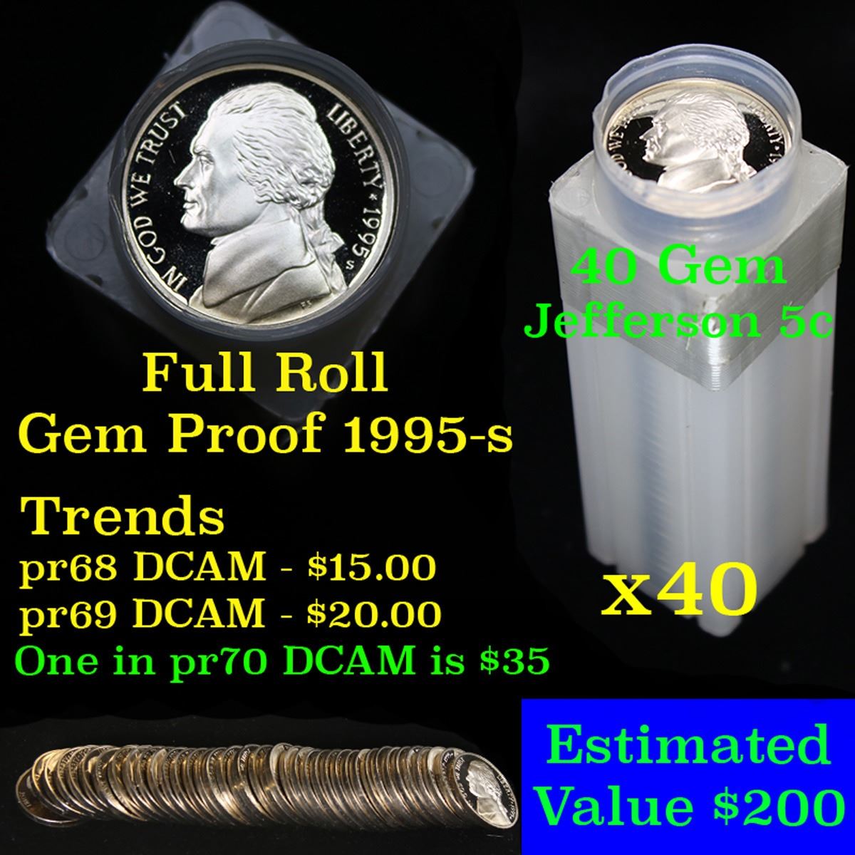 Proof 1995-s Jefferson nickel 5c roll, 40 pieces . .. A great proof roll of Jefferson nickels. All coins are deep cameo. In pr68 DCAM $15/coin PR69 DCAM $20/coin