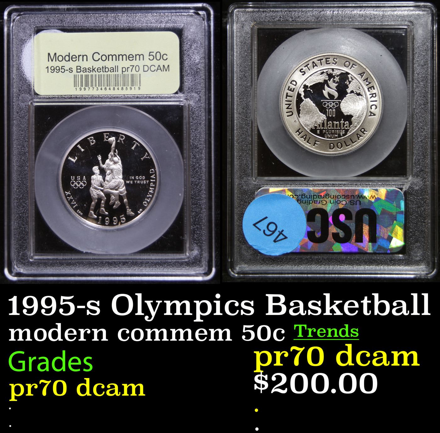 1995-s Olympics Basketball Modern Commem Half Dollar 50c Graded GEM++ Proof Deep Cameo By USCG. The 1995 Olympic Basketball Half Dollar was issued as one of two commemorative half dollar coins for the Atlanta XXVI Olympiad Summer Games. This example has been Encapsulated and Graded PR70 DCAM by USCG.