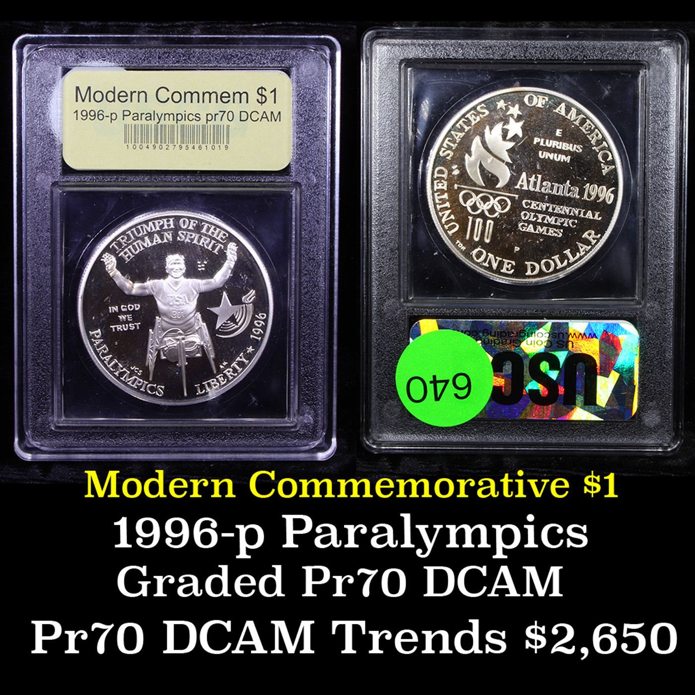 1996-P Olympics Paralympics Modern Commem Dollar $1 Graded GEM++ Proof Deep Cameo By USCG. The 1996 Paralympics Silver Dollar was issued as part of an extensive program of commemorative coins for the XXVI Olympiad held in Atlanta, Georgia. There were a total of sixteen different coins issued for the program over the course of two years. This Perfect coin is graded Perfection Gem+++ Proof Deep cameo by USCG.