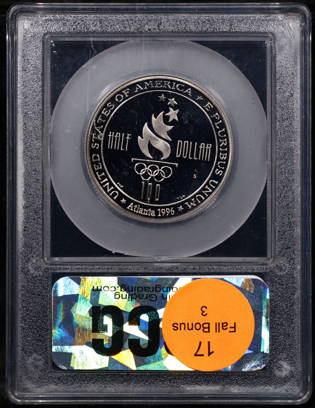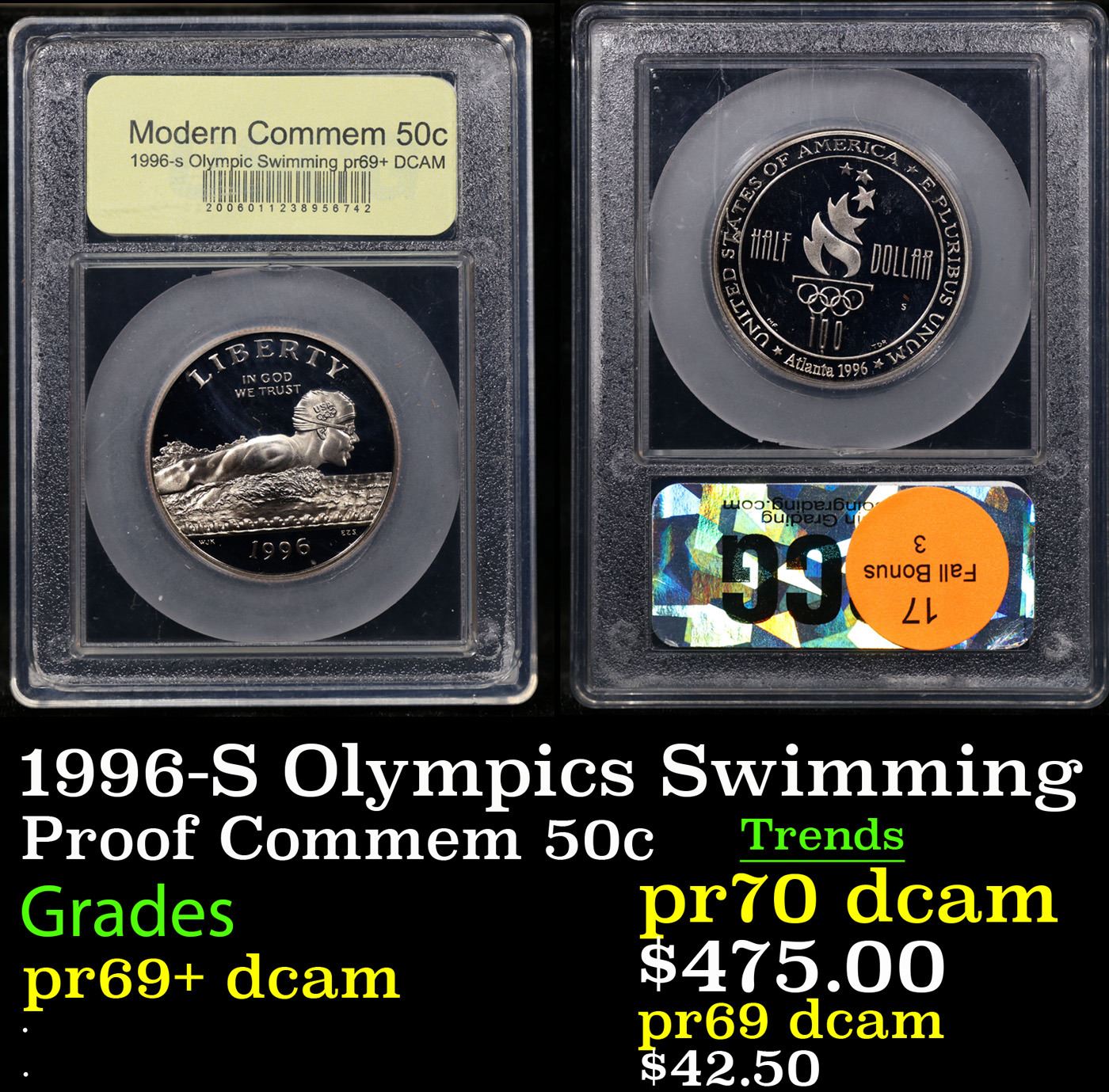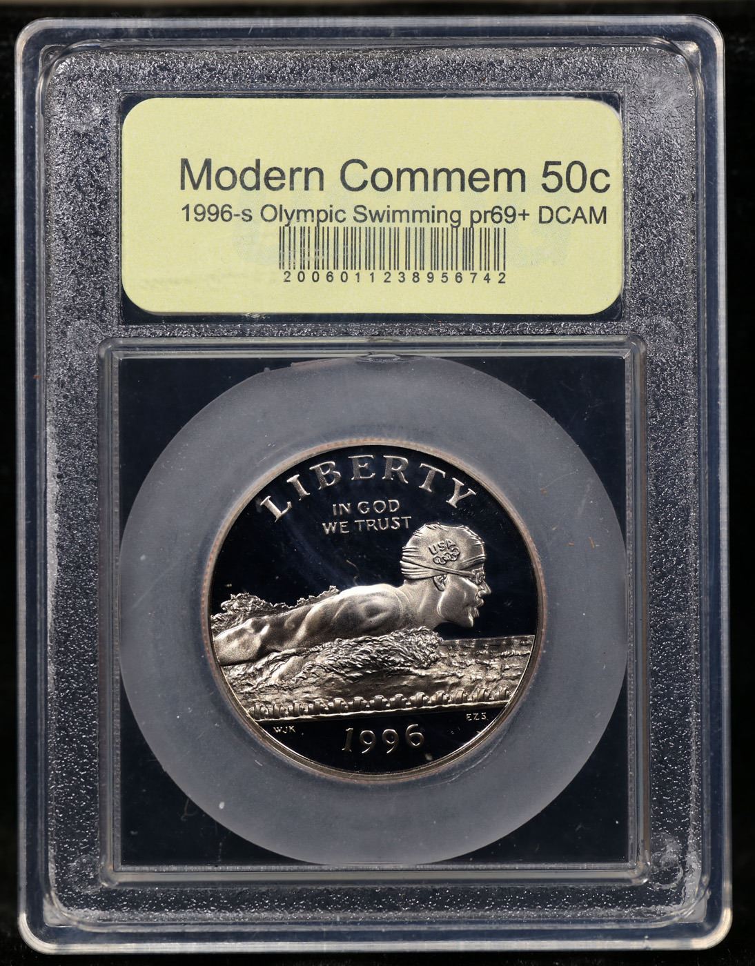 1996-S Olympics Swimming Modern Commem Half Dollar 50c Graded pr69+ dcam By USCG. The 1996 Olympic Swimming 50c was issued as part of a program of commemorative coins for the XXVI Olympics held in Atlanta. There were a total of sixteen different coins issued for the program over the course of two years.